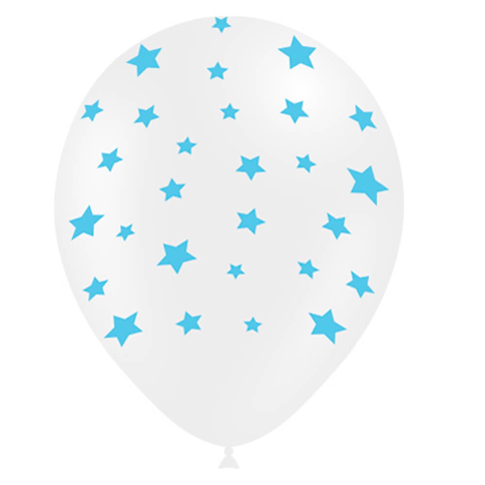 Estos globos impresos con estrellas azules sobre fondo blanco son ideales para decorar fiestas y eventos infantiles, como babyshowers, bautizos, comuniones y cumpleaños, combínalos con otros globos para conseguir una decoración impactante.