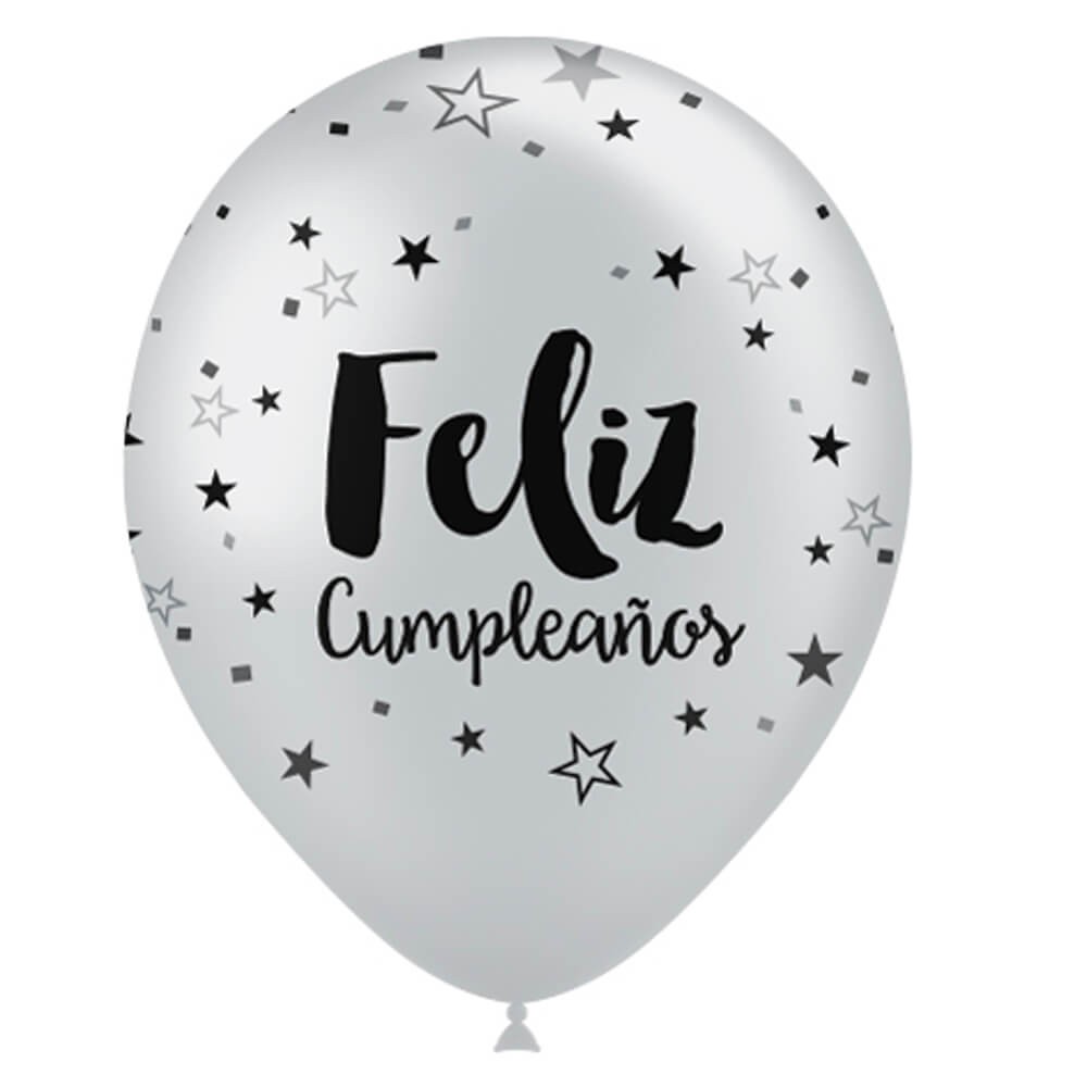 Globos feliz cumpleaños con un diseño moderno en color plata con detalles negros, fabricados 100% en látex biodegradable.