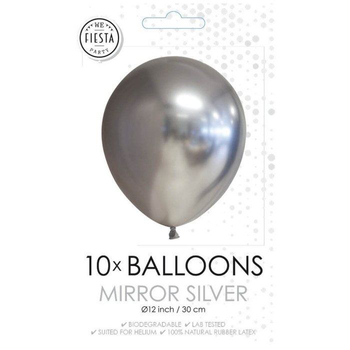 Paquete con 10 globos de látex de 30cm en color plata cromado con un espectacular acabado espejo, biodegradables y aptos para helio o aire. Ideales para decorar cualquier evento.