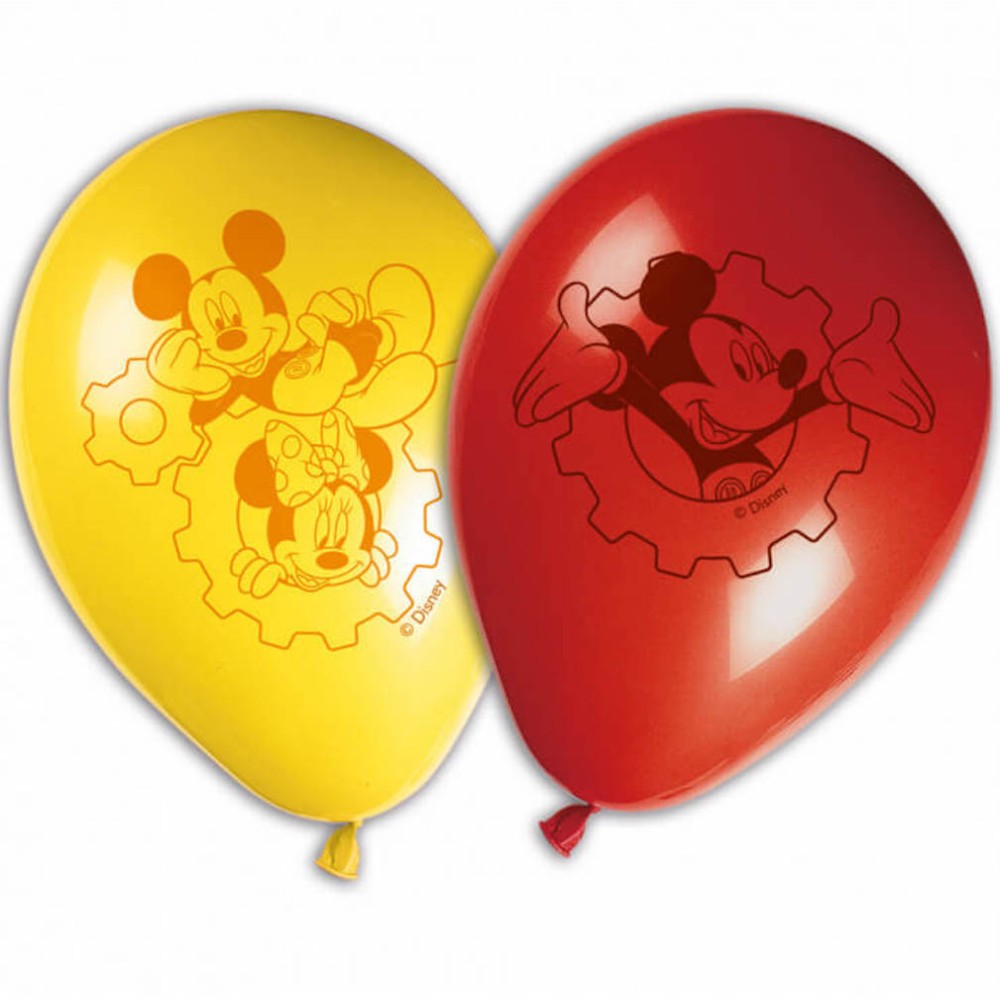 Paquete con 8 globos de látex rojos y amarillos con dibujos Mickey Mouse. Licencia Disney.
