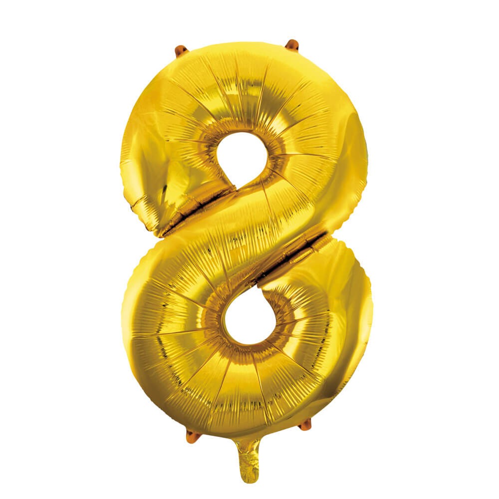 Globo número 8 realizado en foil metálico de color oro, ideal para fiestas de cumpleaños.