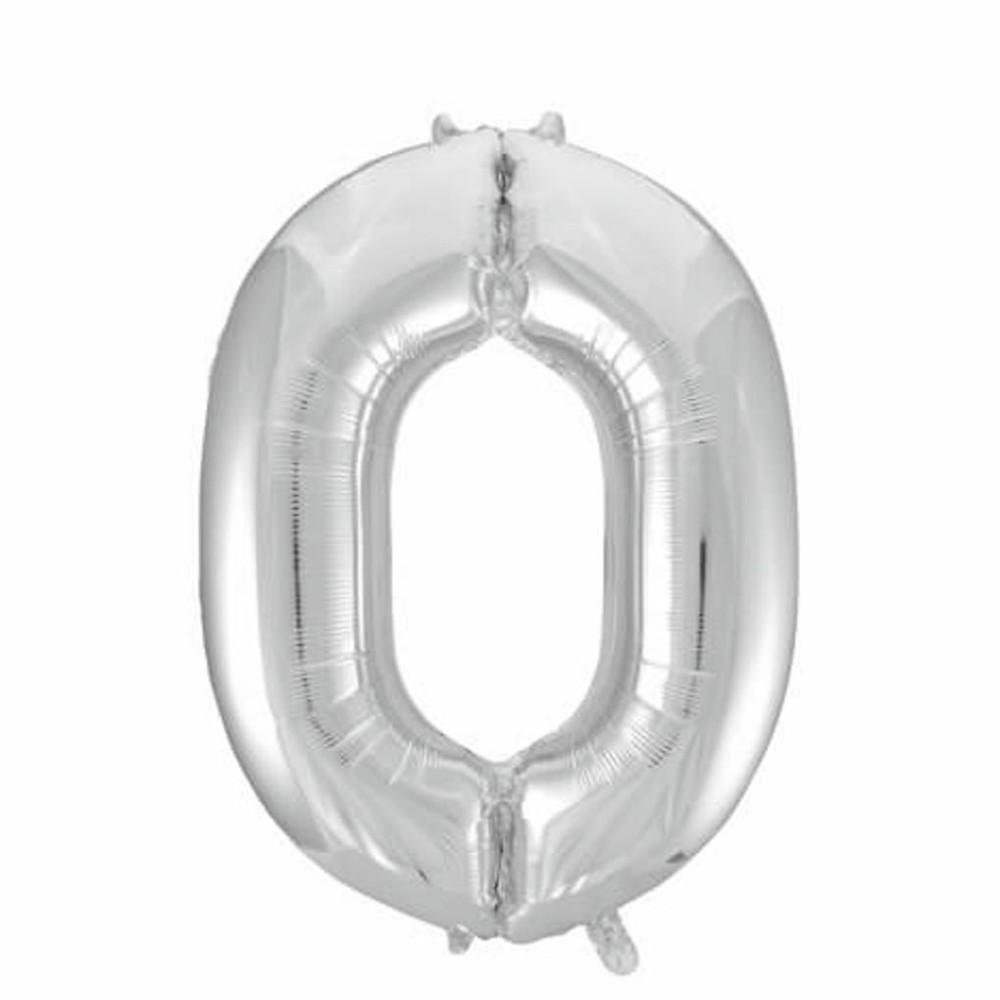 Globo número 0 realizado en foil metálico de color plata, ideal para fiestas de cumpleaños.