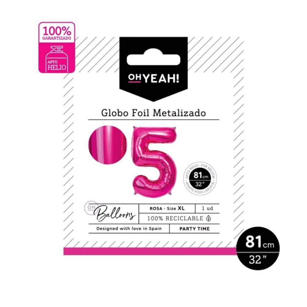 Globo número 5 realizado en foil metalizado de color rosa, ideal para decorar fiestas de cumpleaños.