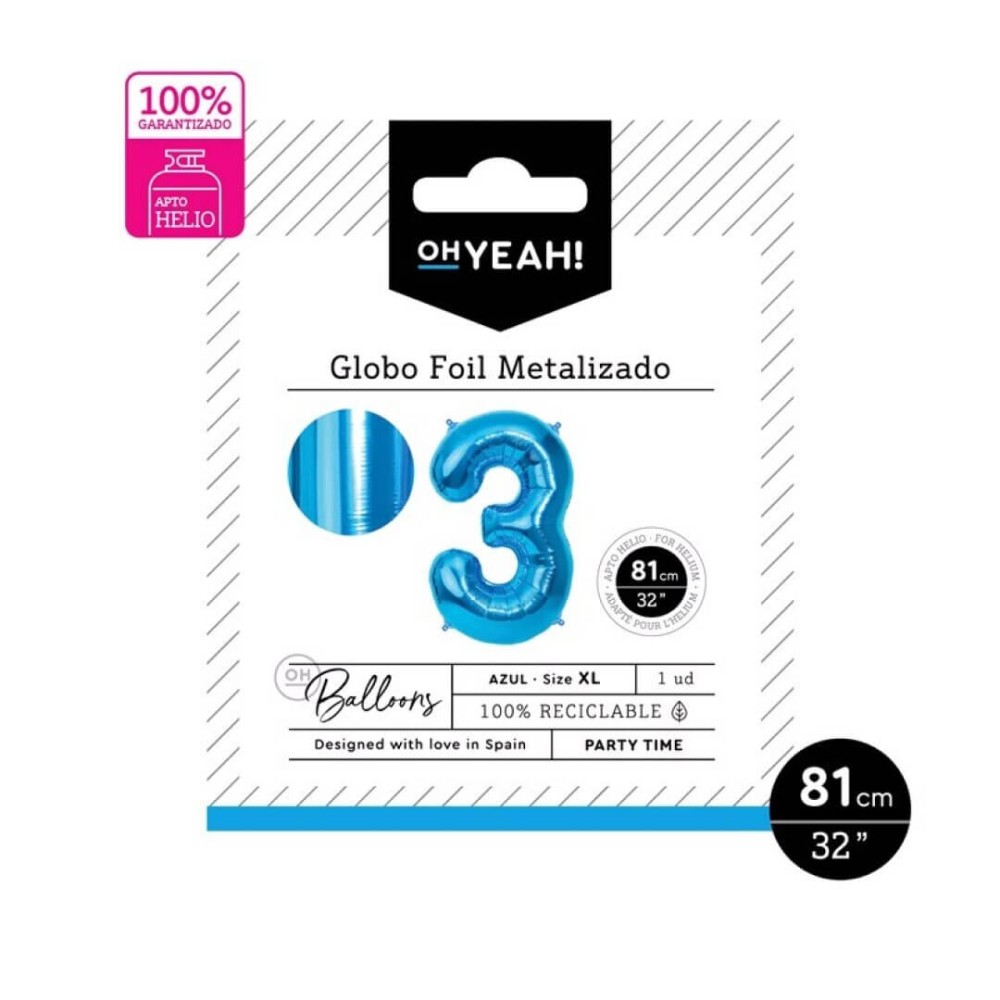 Globo número 3 realizado en foil metalizado de color azul, ideal para decorar fiestas de cumpleaños.