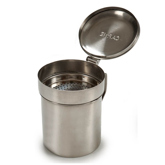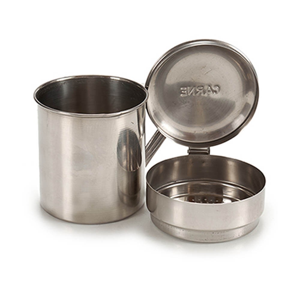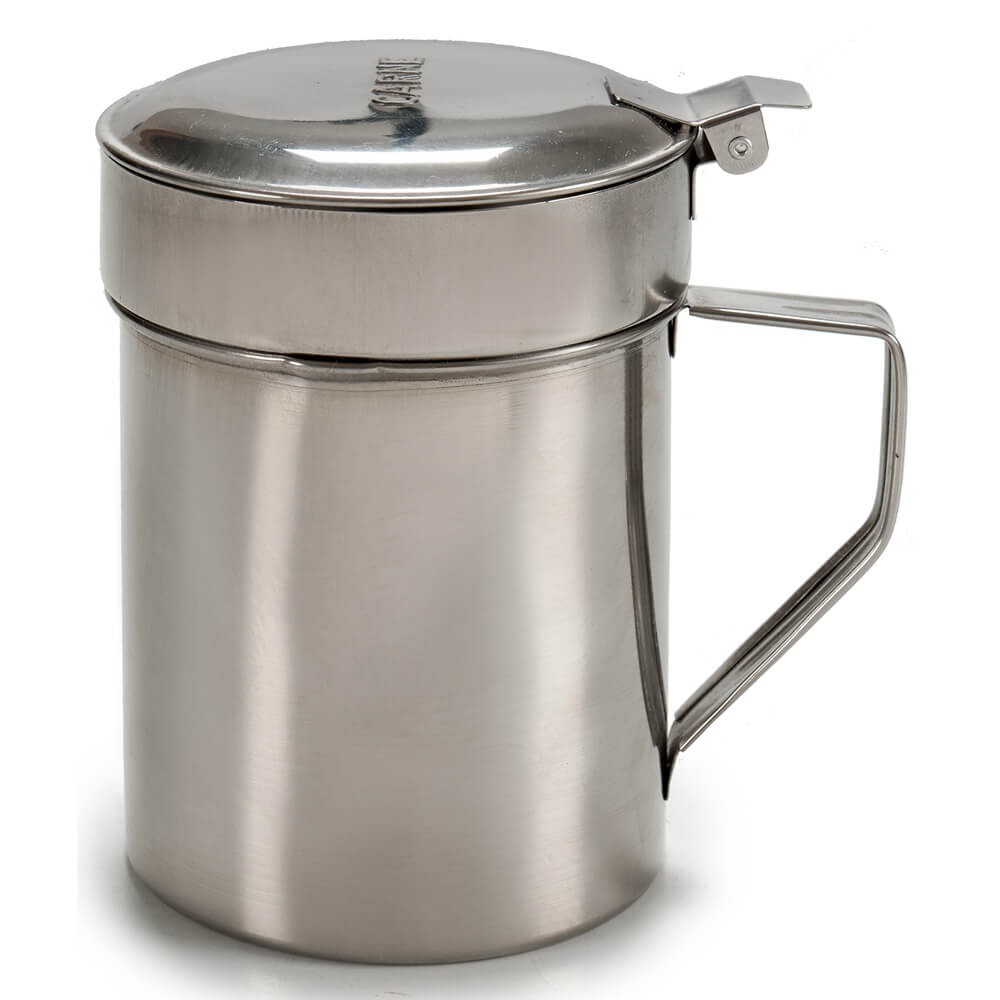 Grasera para carne en acero inoxidable de alta calidad con 500ml de capacidad, colador y tapa, perfecta para reciclar el aceite usado. El colador filtra las impurezas con facilidad y el asa ayuda a verter el aceite sin derrames.