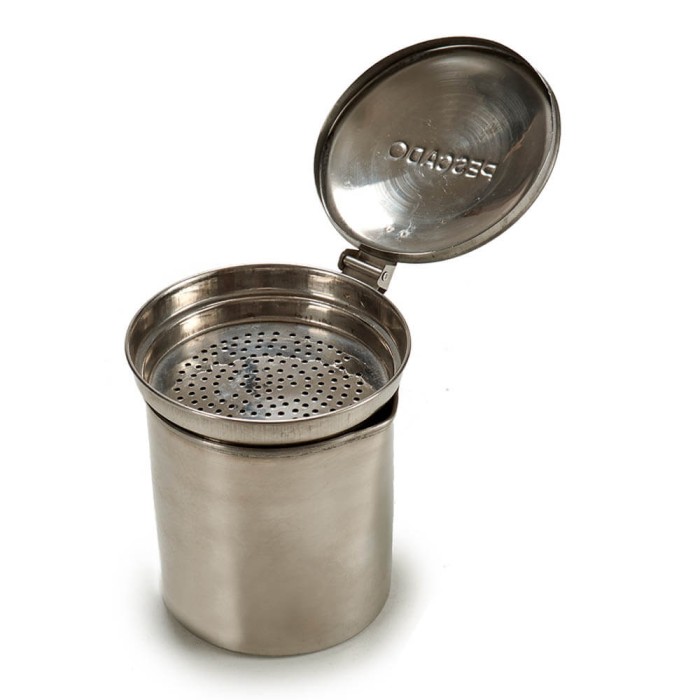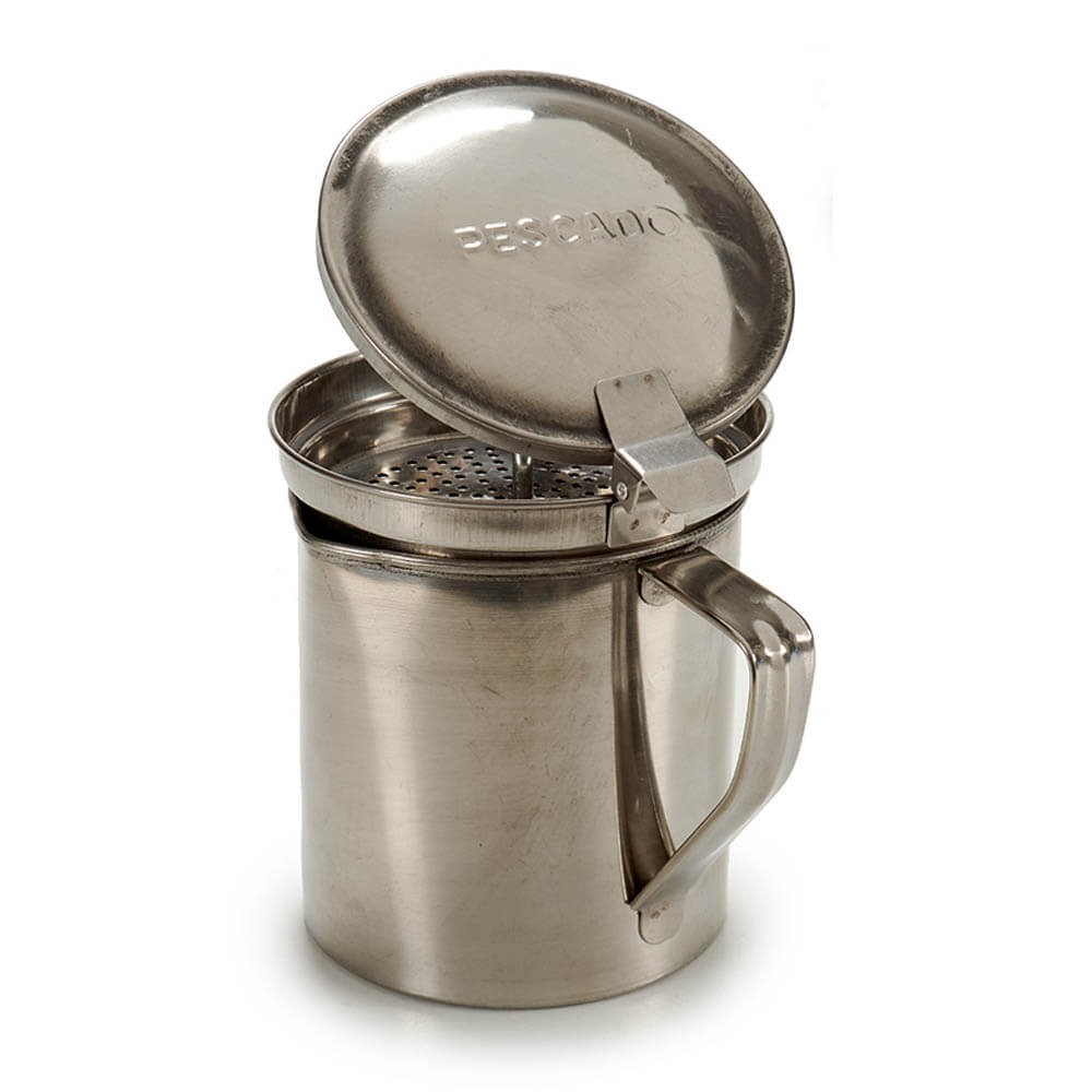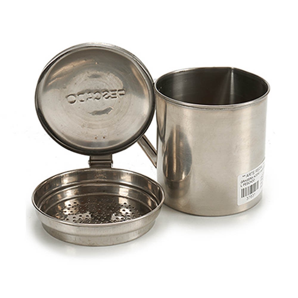 Grasera para pescado en acero inoxidable de alta calidad con 500ml de capacidad, colador y tapa, perfecta para reciclar el aceite usado. El colador filtra las impurezas con facilidad y el asa ayuda a verter el aceite sin derrames.