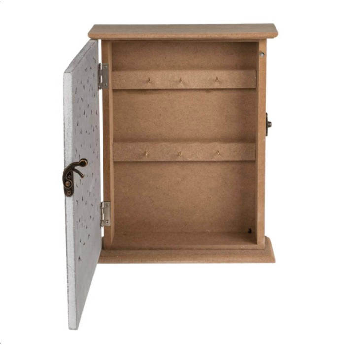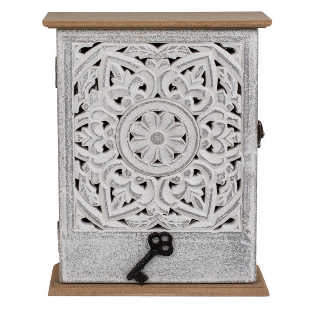 Caja de madera en color natural y decapé blanco con 6 colgadores metálicos para dejar las llaves al llegar a casa, la puerta calada esta decorada con un bonito mandala floral y una llave negra.
