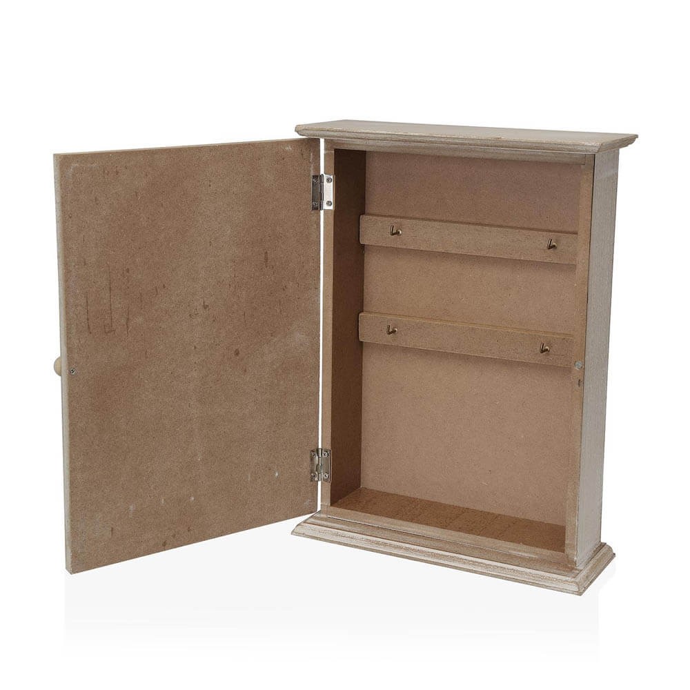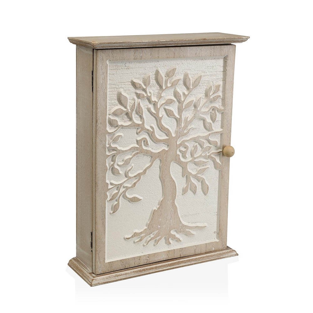 Cuenta con 4 ganchos metálicos en el interior, una tapa embellecedora con el árbol de la vida tallado y con un práctico tirador para que abras la caja fácilmente y dos colgadores en la trasera para que puedas colgarla a la pared con comodidad.