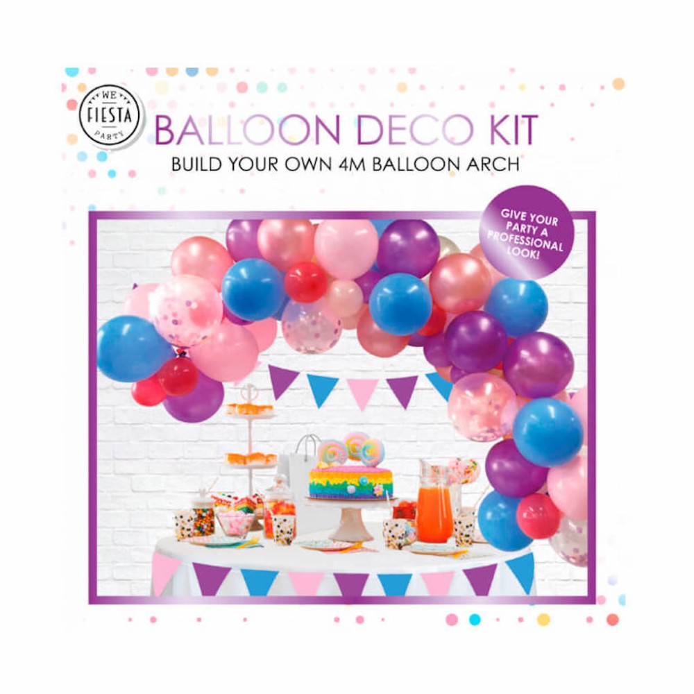 Kit de decoración con globos en color rosa, azul y morado para que crees tu propia decoración en casa. Incluye 71 piezas.