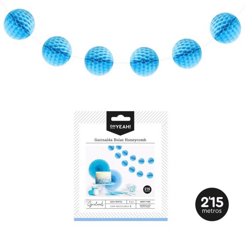 Guirnalda formada por un conjunto de bolas de nido de abeja fabricadas en papel de seda de color azul, perfecta para decorar fiestas infantiles.