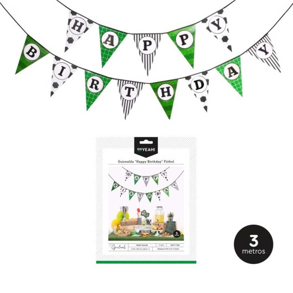 Guirnalda de cartón diseño fútbol compuesta por un conjunto de 13 banderines triangulares formando la palabra happy birthday, perfecta para decorar fiestas de cumpleaños con temática de fútbol.