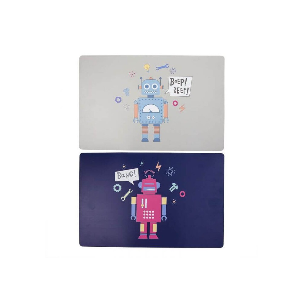 Mantel individual de plástico decorado con un robot, disponible en color gris o azul.