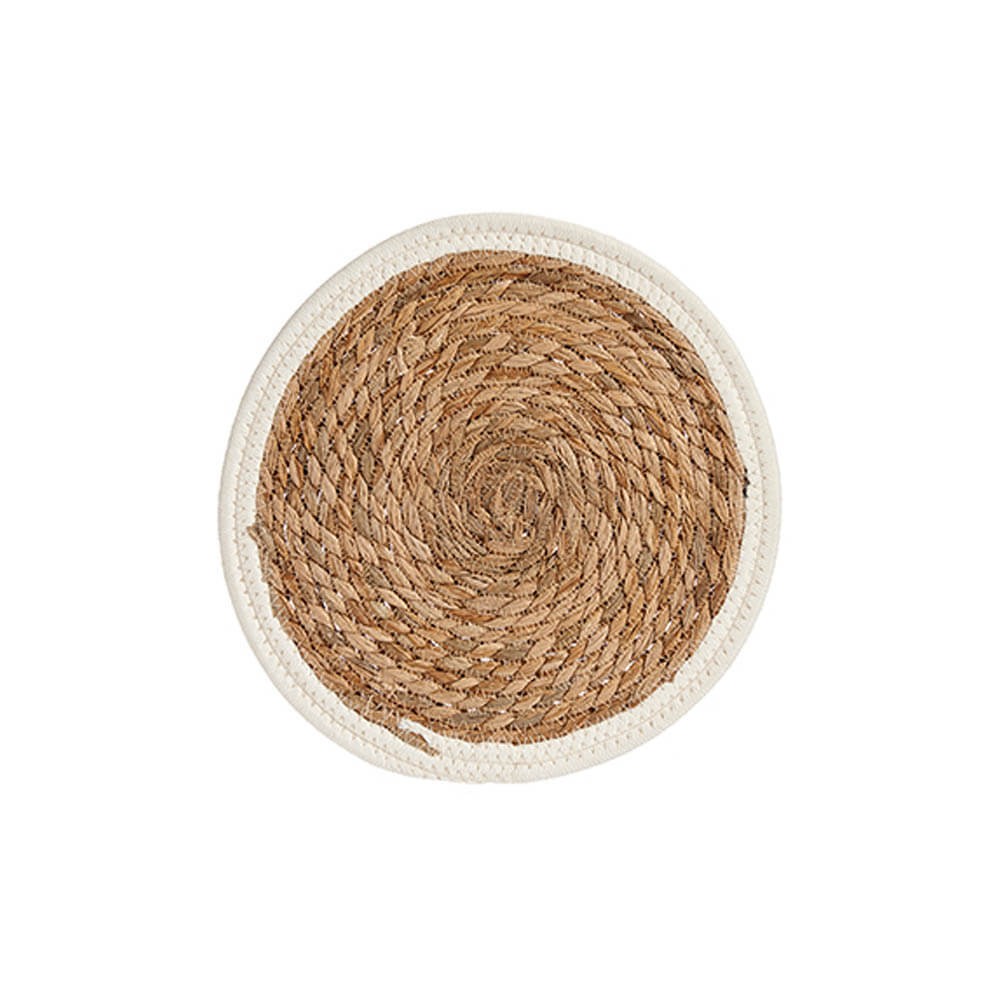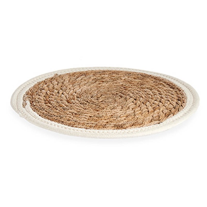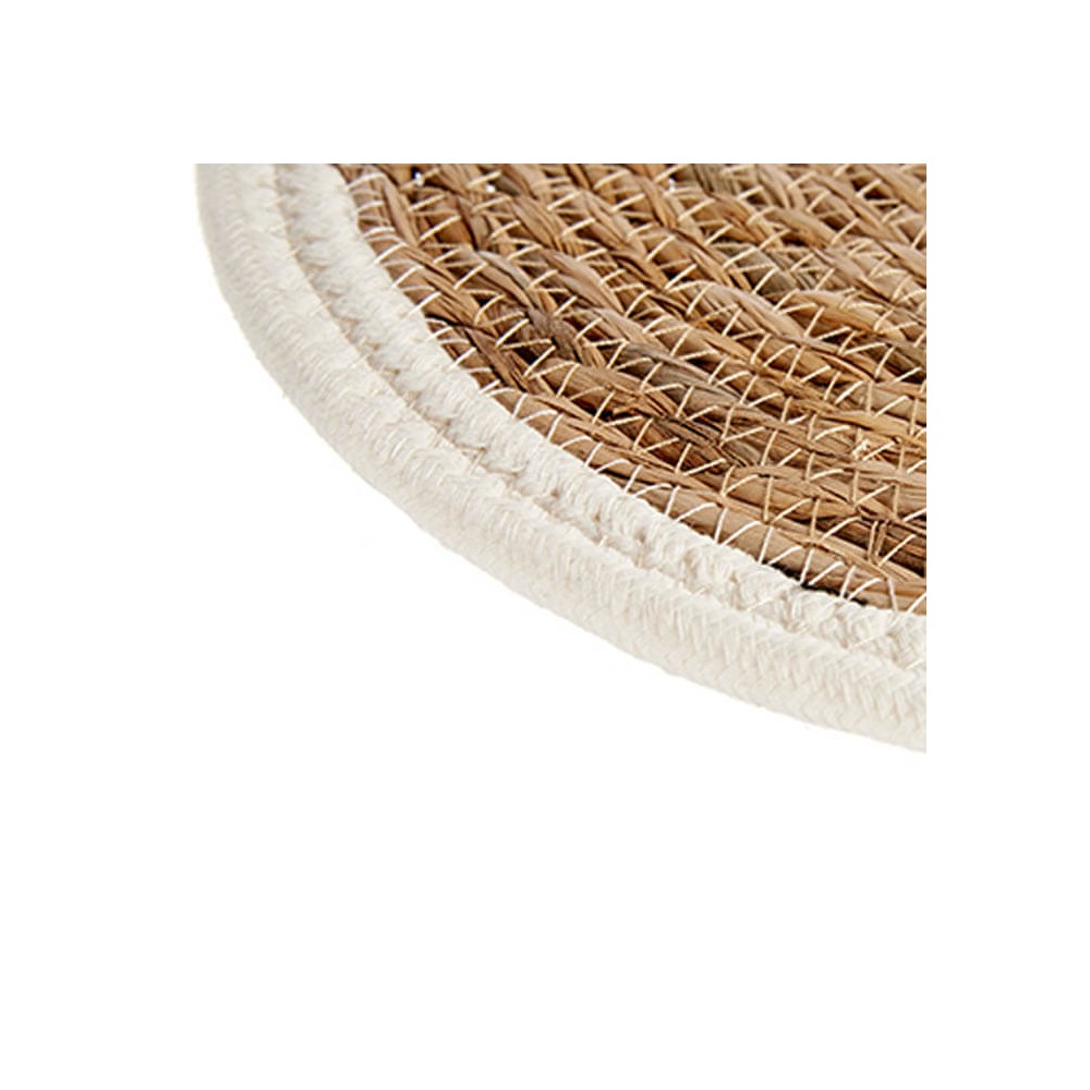 Mantel individual de fibra natural trenzada con el borde de cuerda blanco.