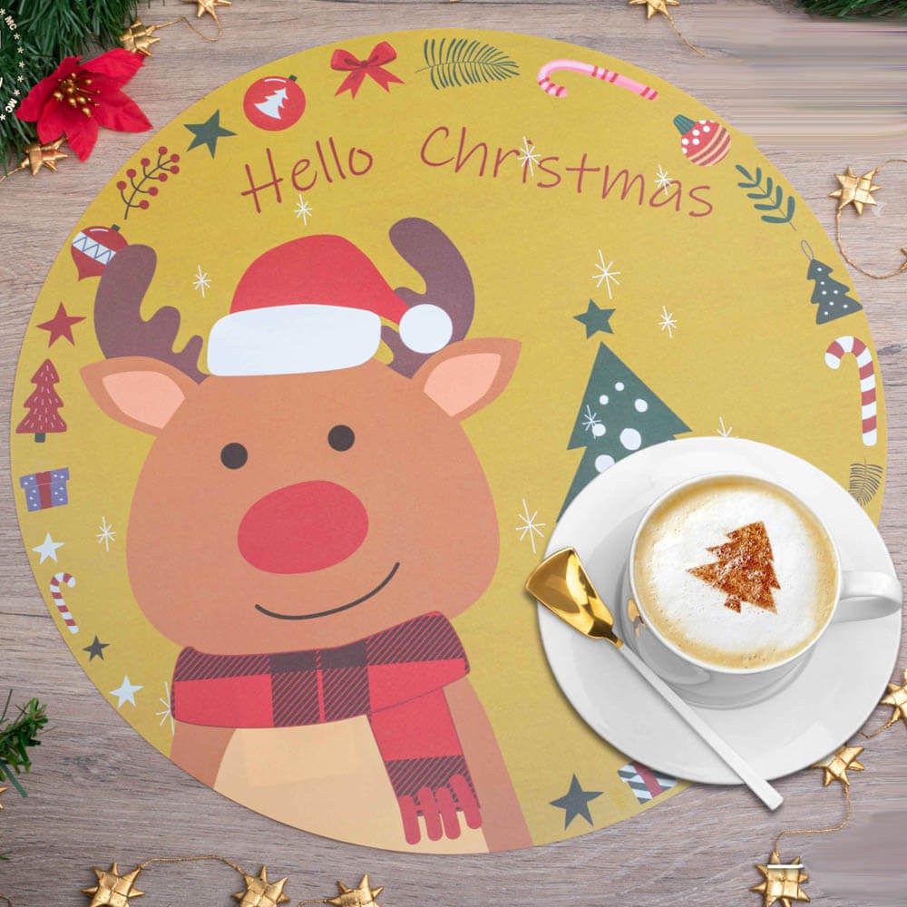 El mantel individual en formato redondo esta fabricado en Polipropileno resistente con un divertido y alegre diseño navideño de un reno con gorro y bufanda para que le des un toque desenfadado y original a tu mesa durante los días de Navidad, ideal para comidas informales, desayunos y meriendas.