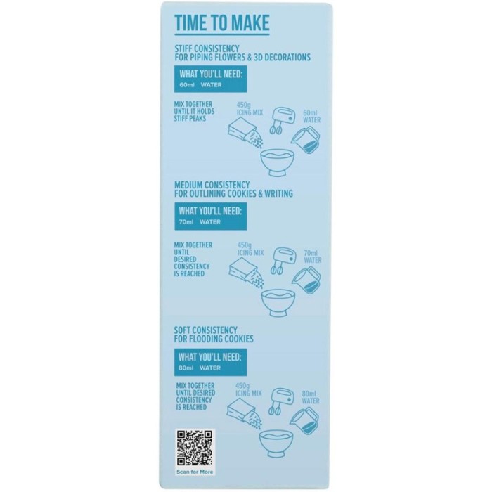 El Preparado de Glasa Real PME 450 g es una solución práctica y profesional para decorar galletas y dulces con resultados impecables. Su fórmula equilibrada permite obtener distintas consistencias simplemente ajustando la cantidad de agua, sin necesidad de añadir clara de huevo fresca.