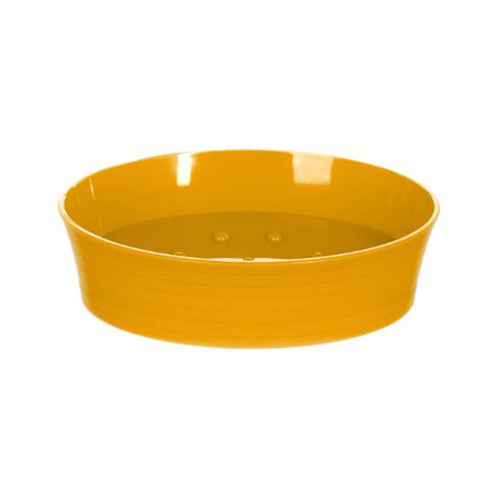 Jabonera de baño para pastilla de jabón realizada en poliestireno de color mostaza con un diseño sencillo en forma ovalada.