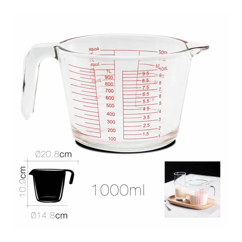 Jarra medidora realizada en cristal resistente con asa y pico para un fácil vertido. Utensilio de cocina fácil de manejar, super práctico para medir con precisión líquidos y llevar a cabo diferentes recetas. La jarra medidora tiene capacidad para 1000 ml.