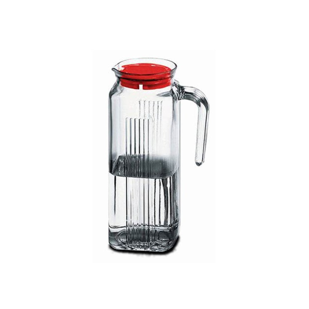 Jarra de agua para nevera de 1 litro de capacidad realizada en vidrio transparente con asa y tapa roja de PVC.