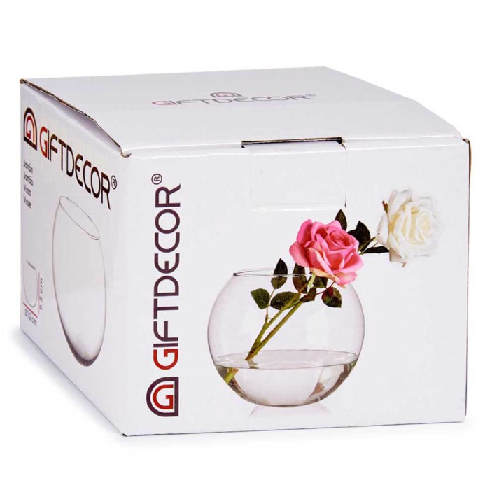 Jarrón de cristal realizado en vidrio transparente con forma redondeada, perfecto como complemento de decoración para el hogar, su boca facilita la inserción de flores secas, arena, velas y demás complementos en su interior para crear un bonito centro de mesa.