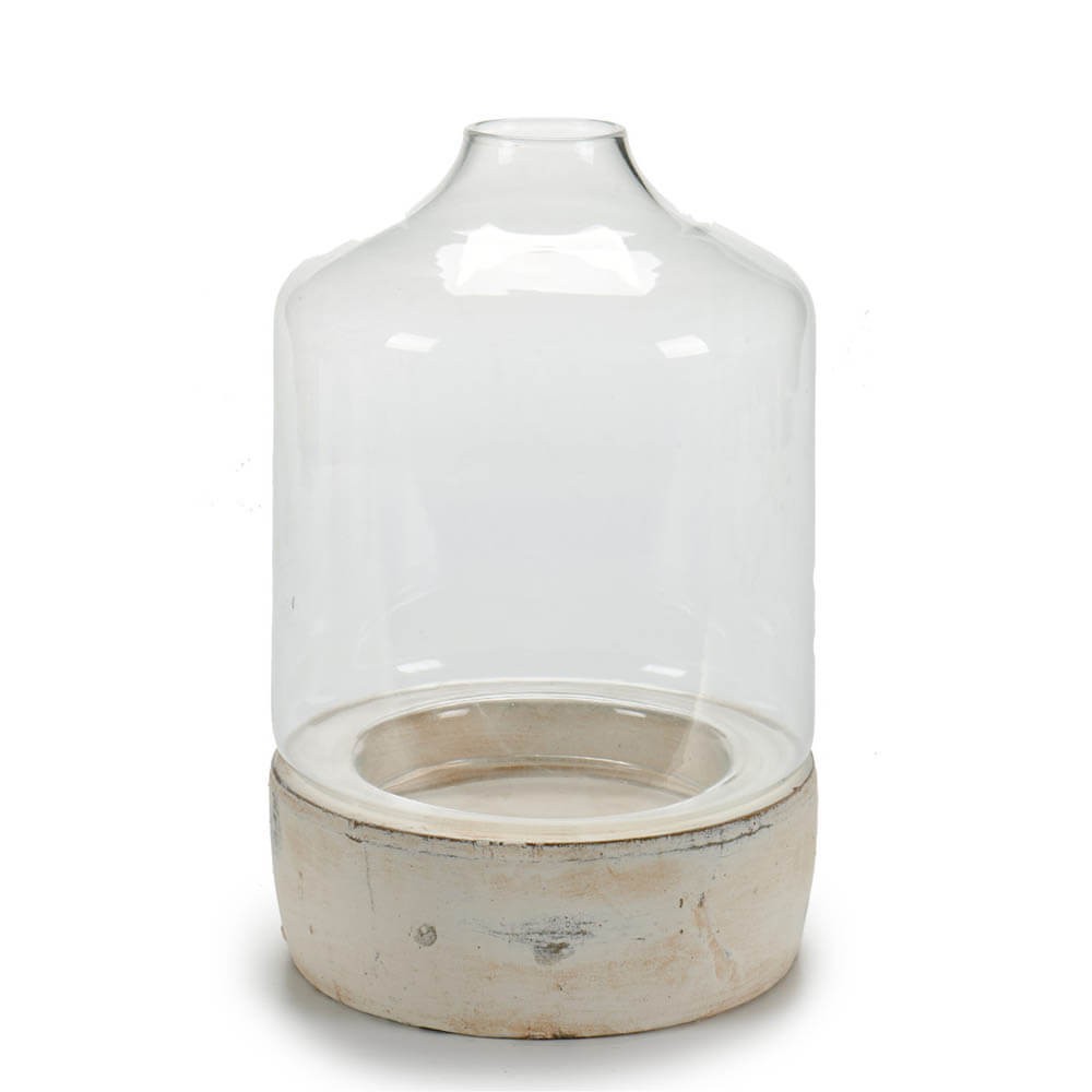 Porta velas decorativo con base de piedra y campana de cristal transparente con orificio, diseño sobrio y elegante en formato redondo con superficie plana para colocar una vela o una planta.