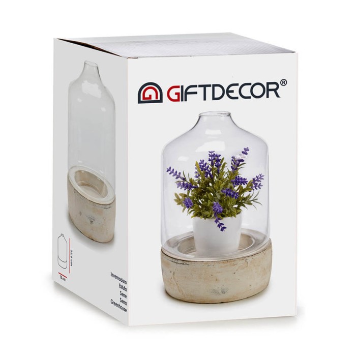 Invernadero decorativo con base de piedra y campana de cristal transparente, ideal para contener una vela o plantas.