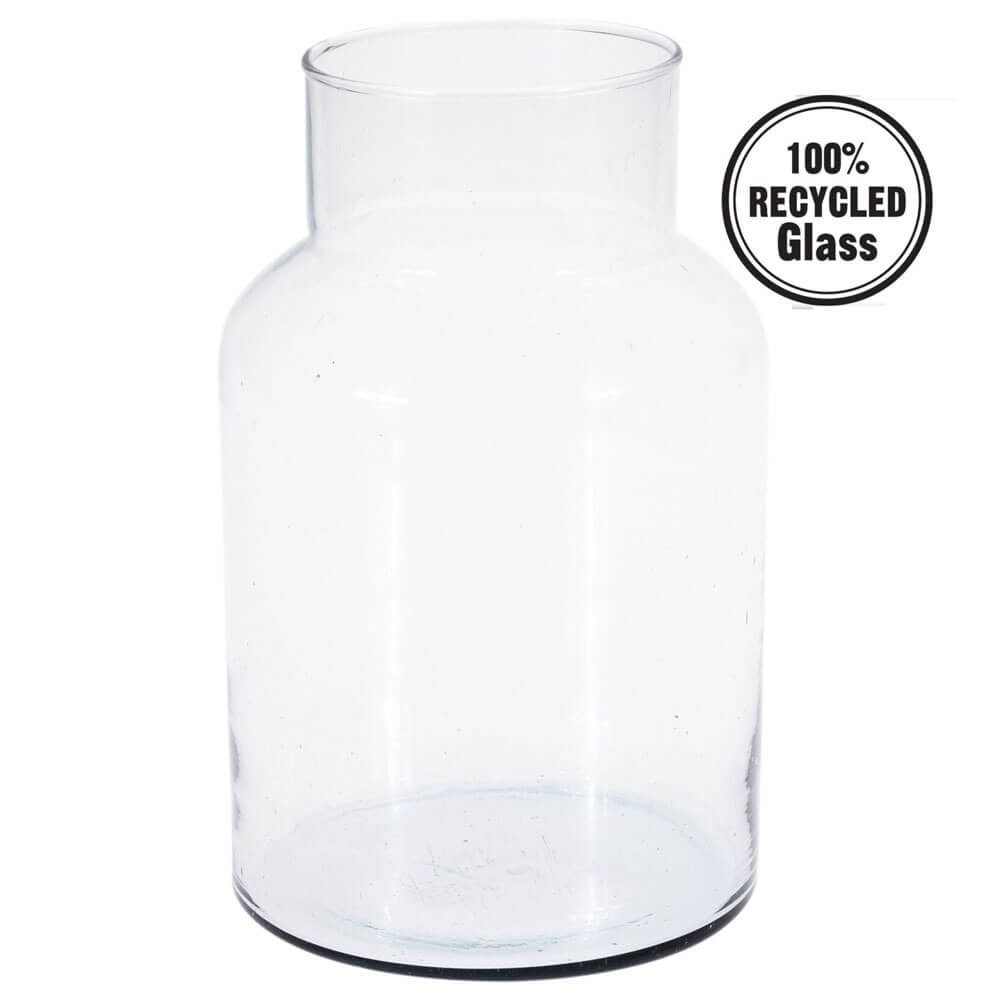 Jarrón de cristal reciclado con un diseño sencillo y tradicional para que brillen tus ramos de flores y le des un toque natural y fresco a tu hogar. Puedes usarlo como florero o en combinación con arena, corteza y velas para realzar mesas, aparadores, cómodas, estantes y demás muebles de tu hogar.