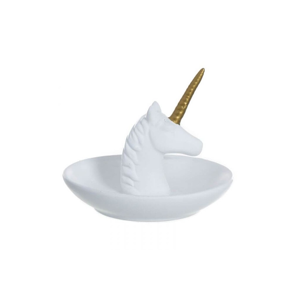 Joyero para anillos en forma de plato decorado con la cabeza de un unicornio en 3D con el cuerno dorado. Este plato es super práctico para depositar los anillos que vayas a volver a usar, puedes poner el plato en la mesita de noche, en el baño o en el aparador para dejar los anillos cuando llegues a casa y tenerlos a mano cuando vayas a salir.