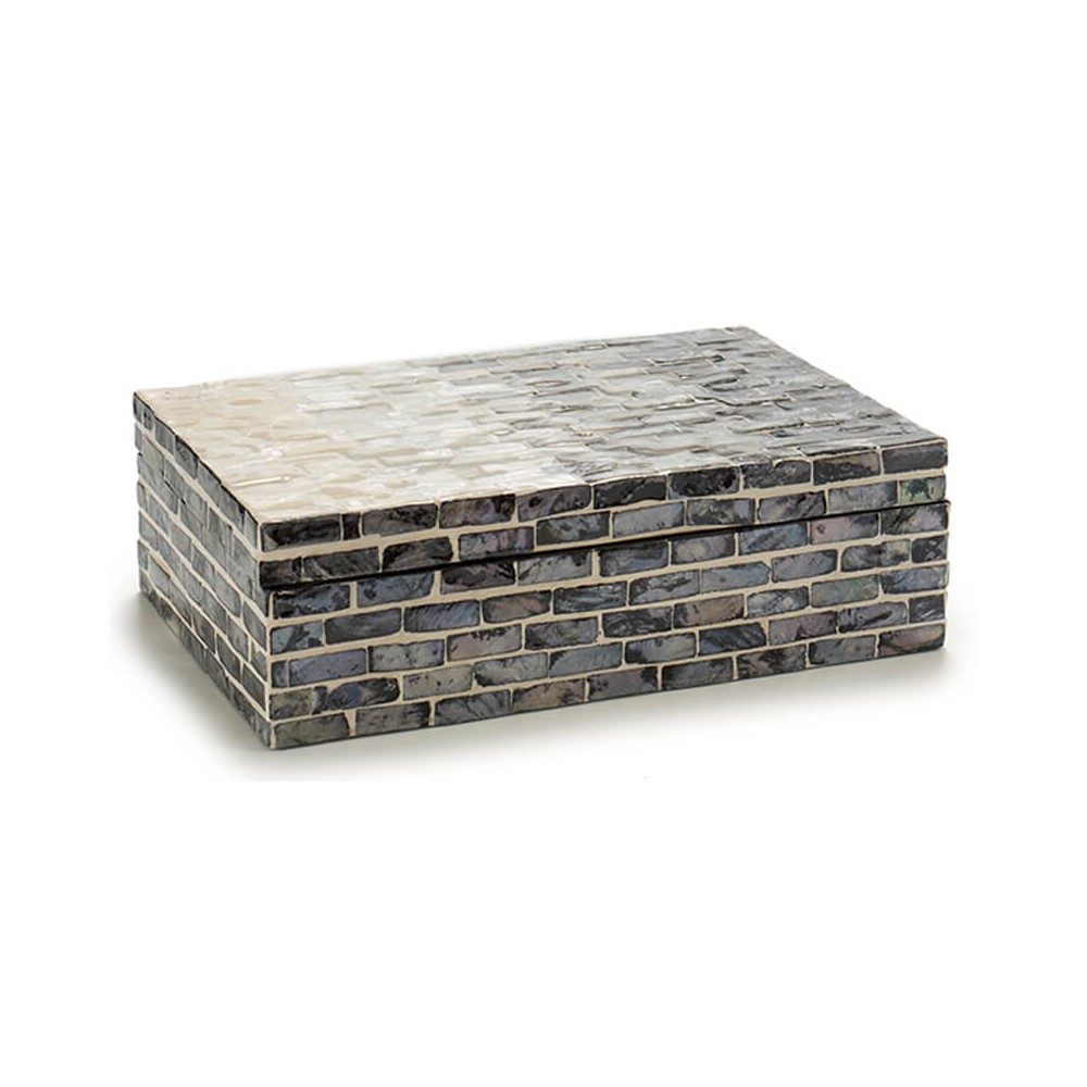 Caja decorativa de nácar fabricada en DM recubierto de piezas de nácar en color gris degradado, ideal como complemento de decoración para el hogar.