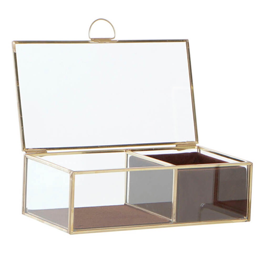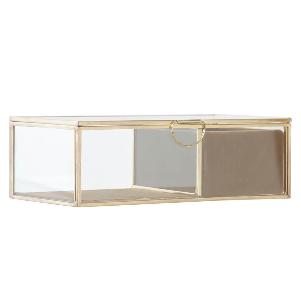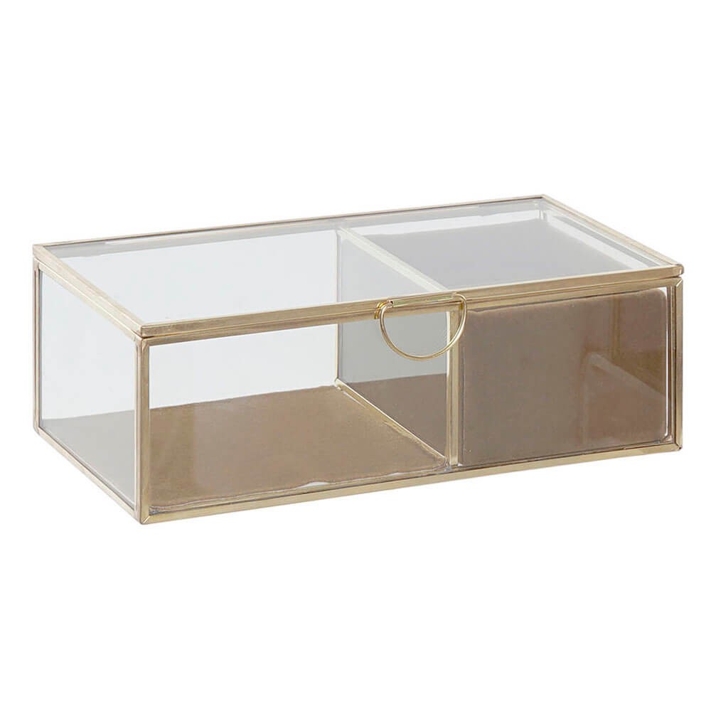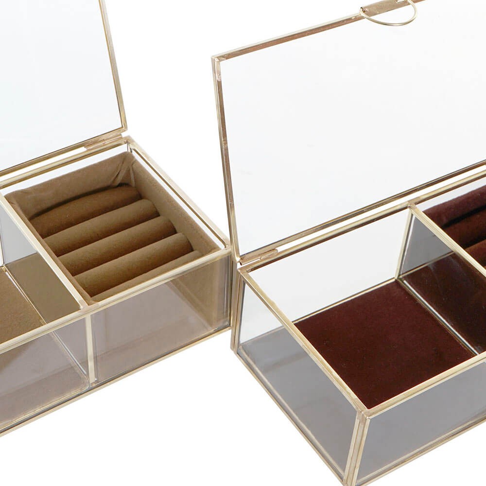 El joyero tiene un diseño sencillo en forma rectangular con estructura resistente metálica con acabado dorado y cuerpo de cristal transparente, lleva tapa abatible y dos compartimentos, uno con rendijas para que coloques los anillos y otro liso para pulseras y collares, ambos están forrados con tejido de poliéster aterciopelado para cuidar y proteger tus joyas.