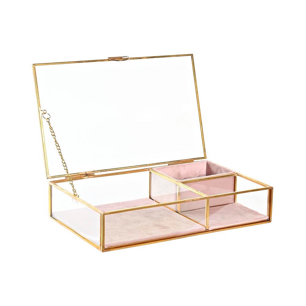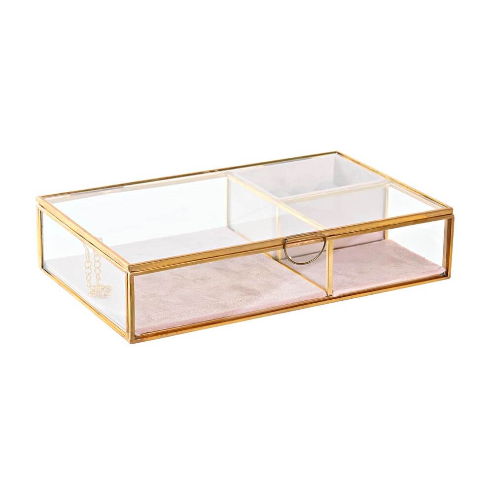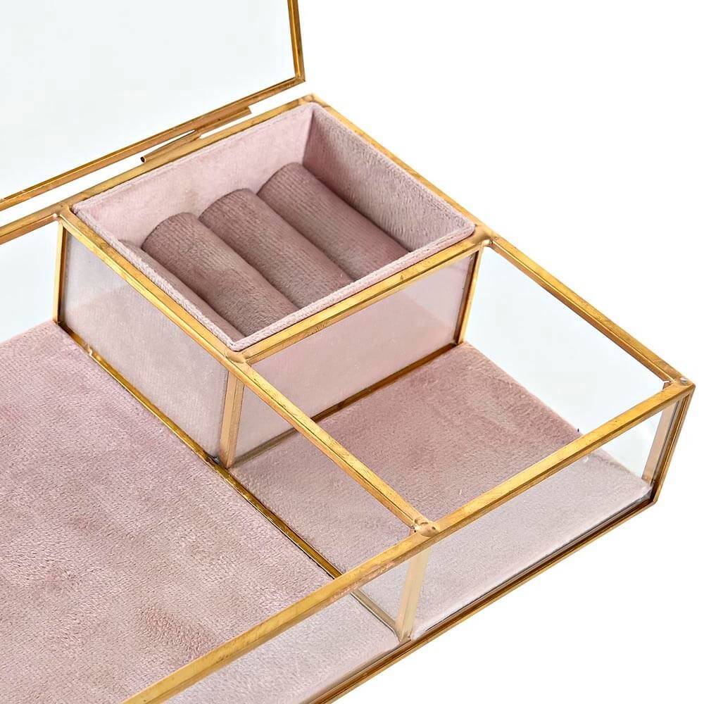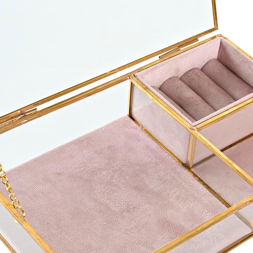 El joyero tiene un diseño sencillo en forma rectangular con estructura resistente metálica con acabado dorado y cuerpo de cristal transparente, lleva tapa abatible y tres compartimentos, uno con rendijas para que coloques los anillos y los otros lisos para pulseras, collares y accesorios del pelo, ambos están forrados en tejido de terciopelo para cuidar y proteger tus joyas.