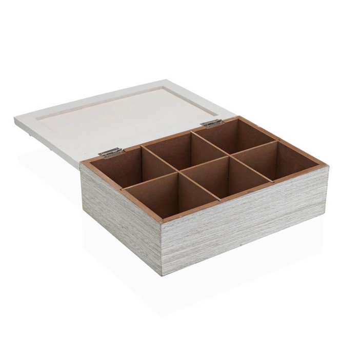 Elegante caja de té realizada en madera MDF con acabado decapé blanco, una pieza imprescindible para los amantes del té y aquellos que buscan mantener su colección de bolsitas de té organizada y accesible. Esta caja de almacenaje con un diseño sofisticado, cuenta con 6 compartimentos que permiten clasificar y almacenar diferentes tipos de té, facilitando la selección perfecta para cada ocasión.
