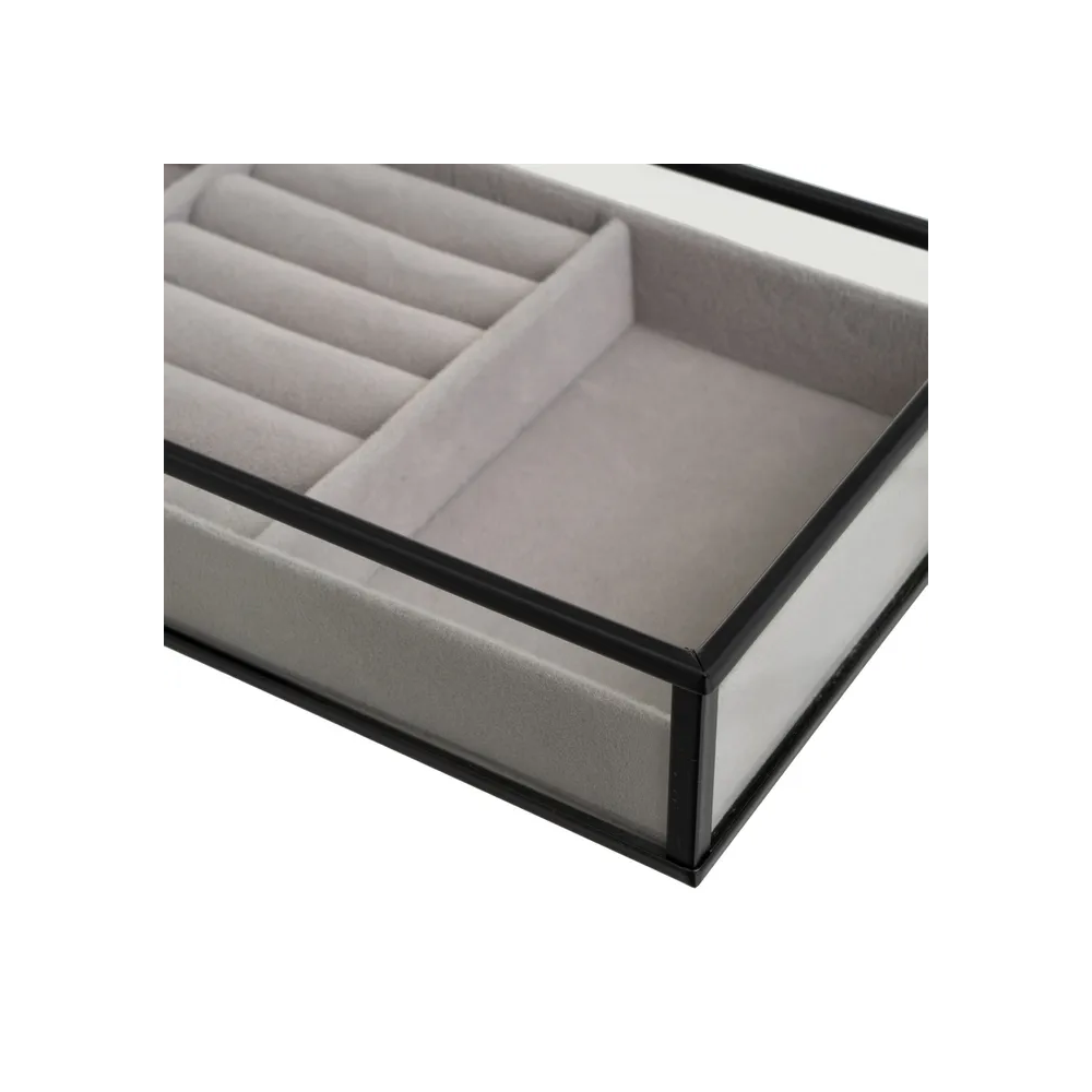 Organiza tus joyas con estilo gracias a esta bandeja joyero de metal y cristal 23x12x4 cm. Su diseño minimalista combina la ligereza del cristal con la solidez del metal, disponible en dos acabados: negro elegante o dorado sofisticado.