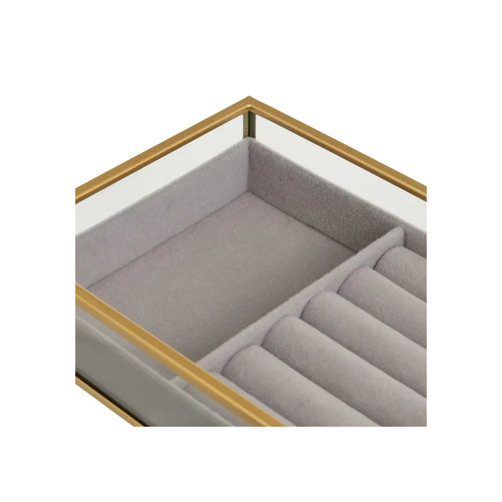 La bandeja incluye compartimentos interiores forrados en suave tejido, ideales para guardar anillos, pendientes, pulseras o relojes de manera ordenada y accesible. Su tamaño compacto permite colocarla sobre cómodas, tocadores o estanterías, aportando un toque decorativo al mismo tiempo que funcional.