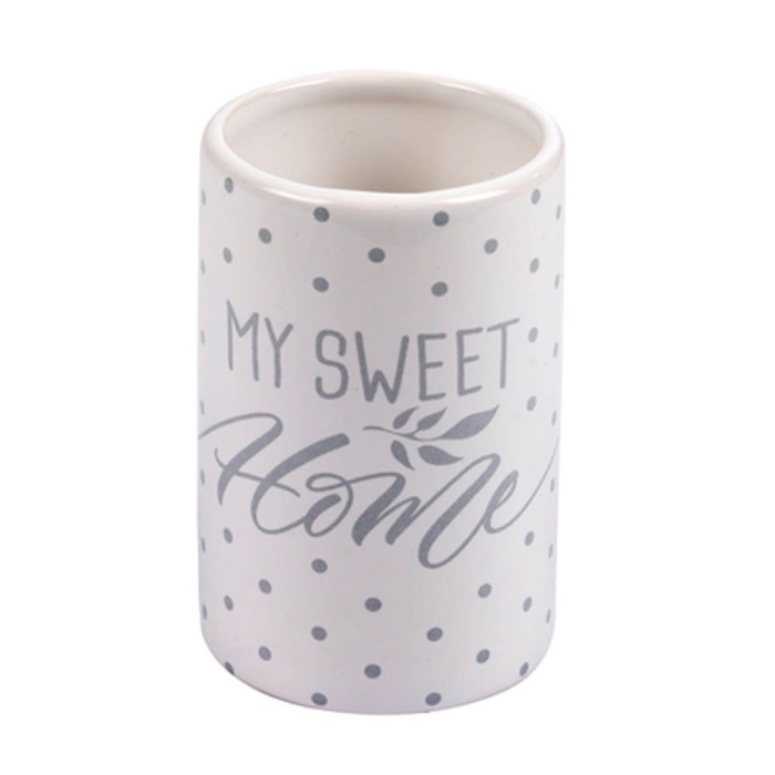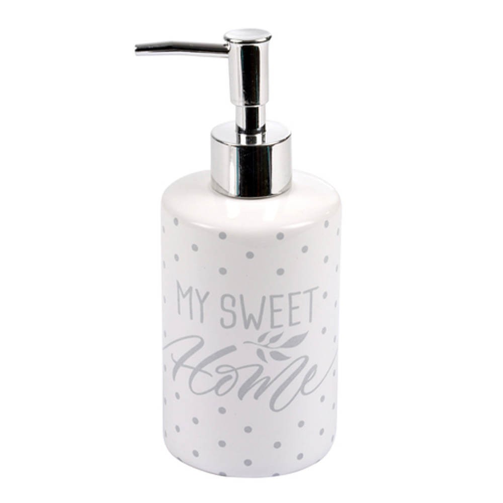 Juego de baño compuesto por tres accesorios, dispensador de jabón manual con cabezal de ABS, vaso portacepillos de dientes y jabonera para pastilla de jabón, realizados en cerámica blanca decorada con lunares grises y frase "My sweet home".
