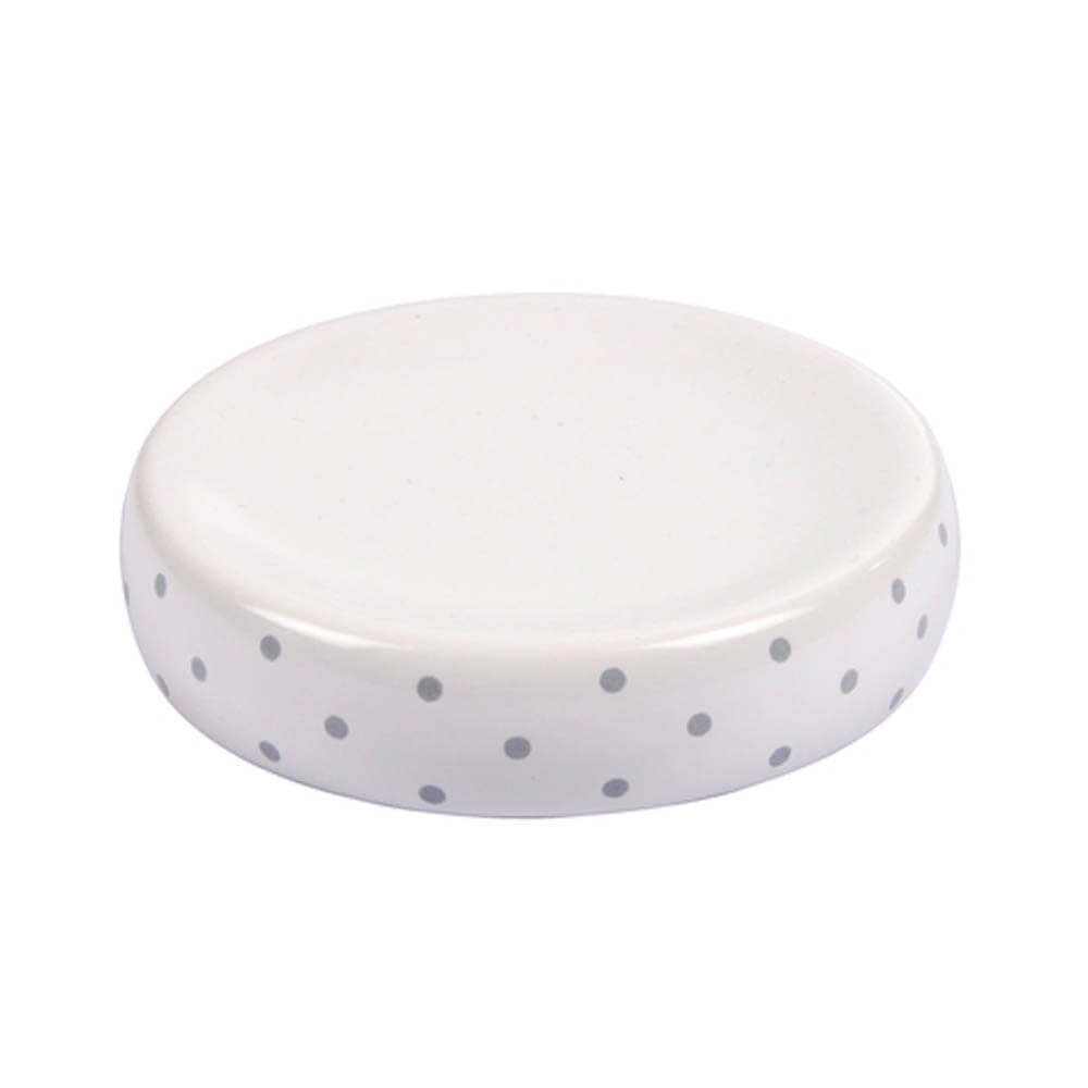 Juego de baño compuesto por tres piezas de cerámica decoradas con lunares grises.
