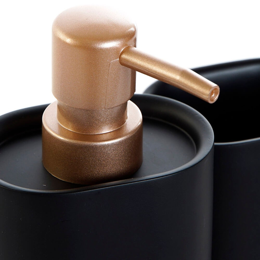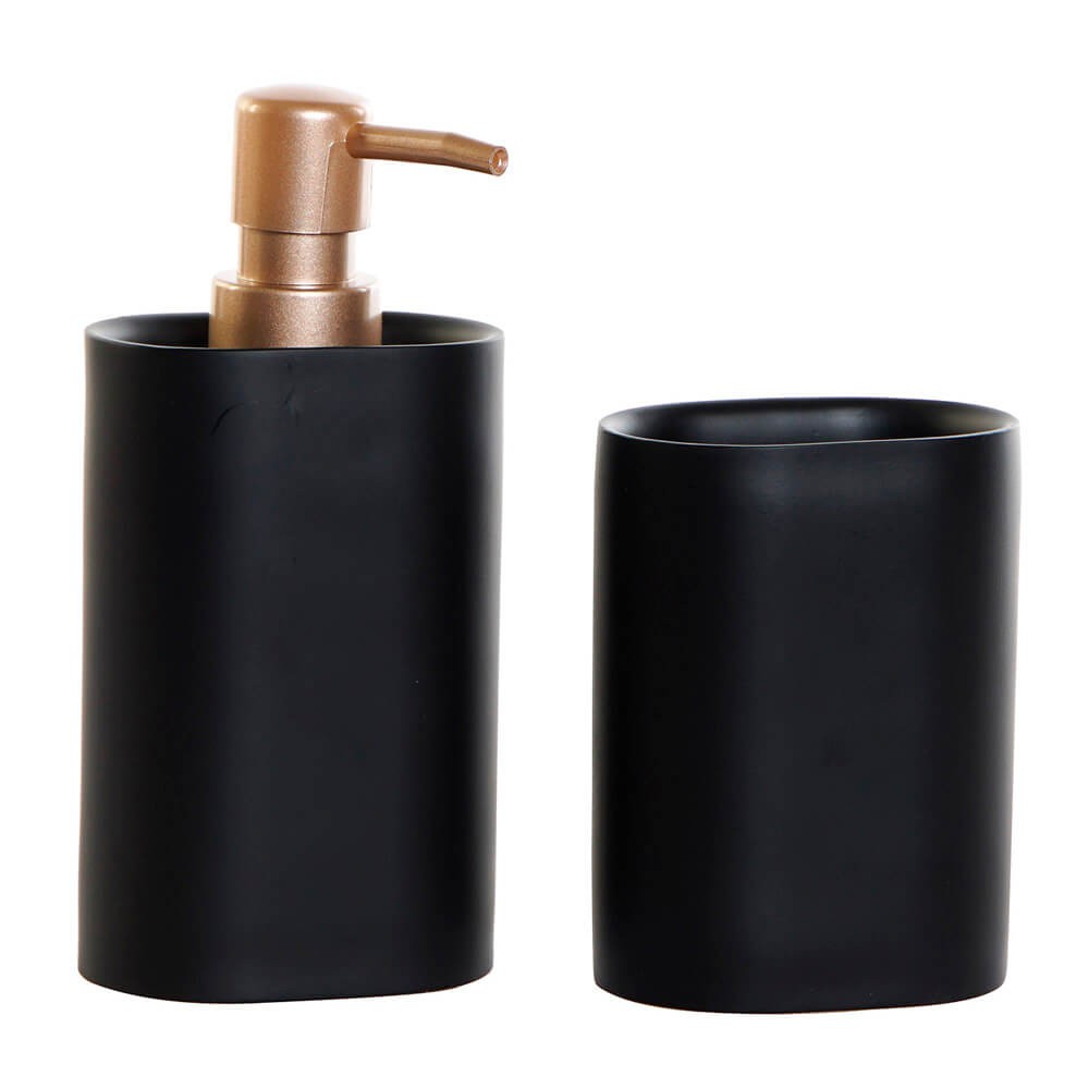 Juego de baño negro compuesto por un vaso portacepillos de dientes y un dispensador de jabón líquido con cabezal de PVC dorado. Ambos accesorios de baño están realizados en resina con un original diseño ovalado en color mate.