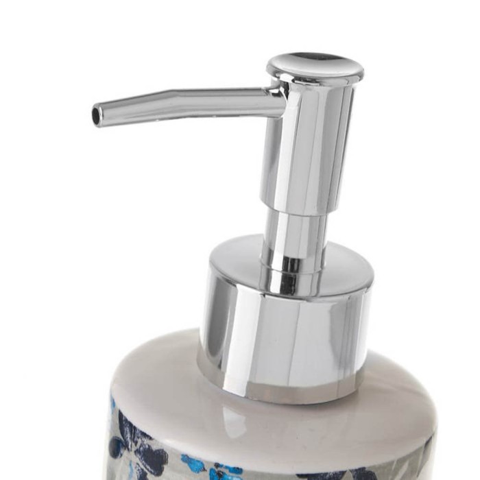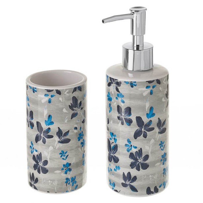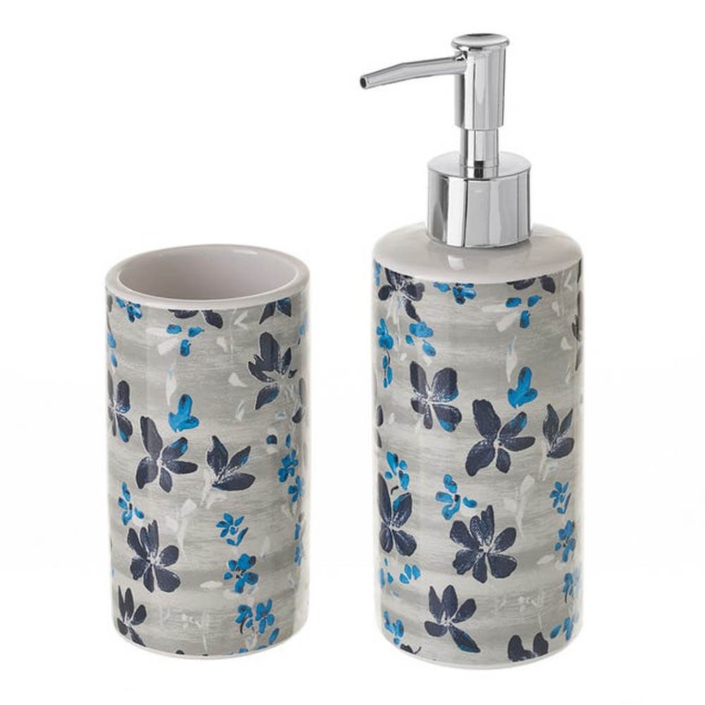Juego de baño compuesto por dos accesorios, dispensador de jabón manual con cabezal de ABS y vaso portacepillos de dientes, ambos accesorios de baño fabricados en cerámica blanca decorada con flores azules sobre fondo gris.