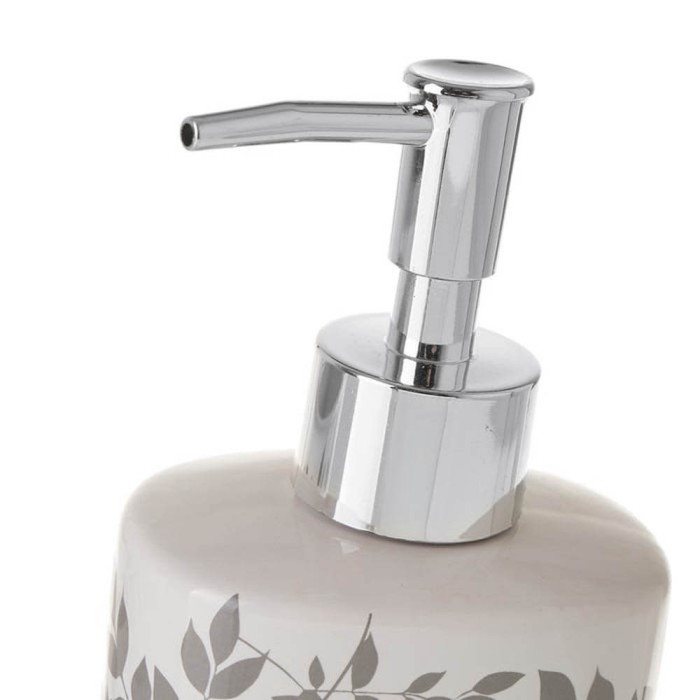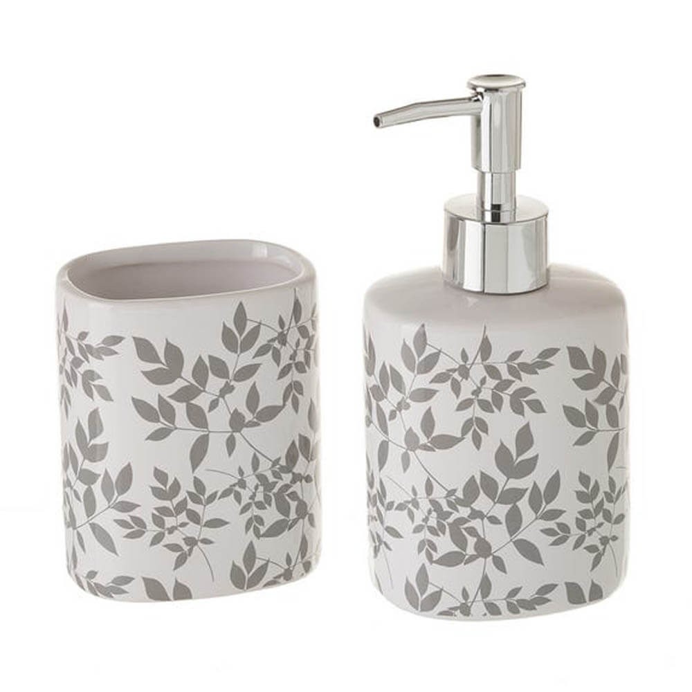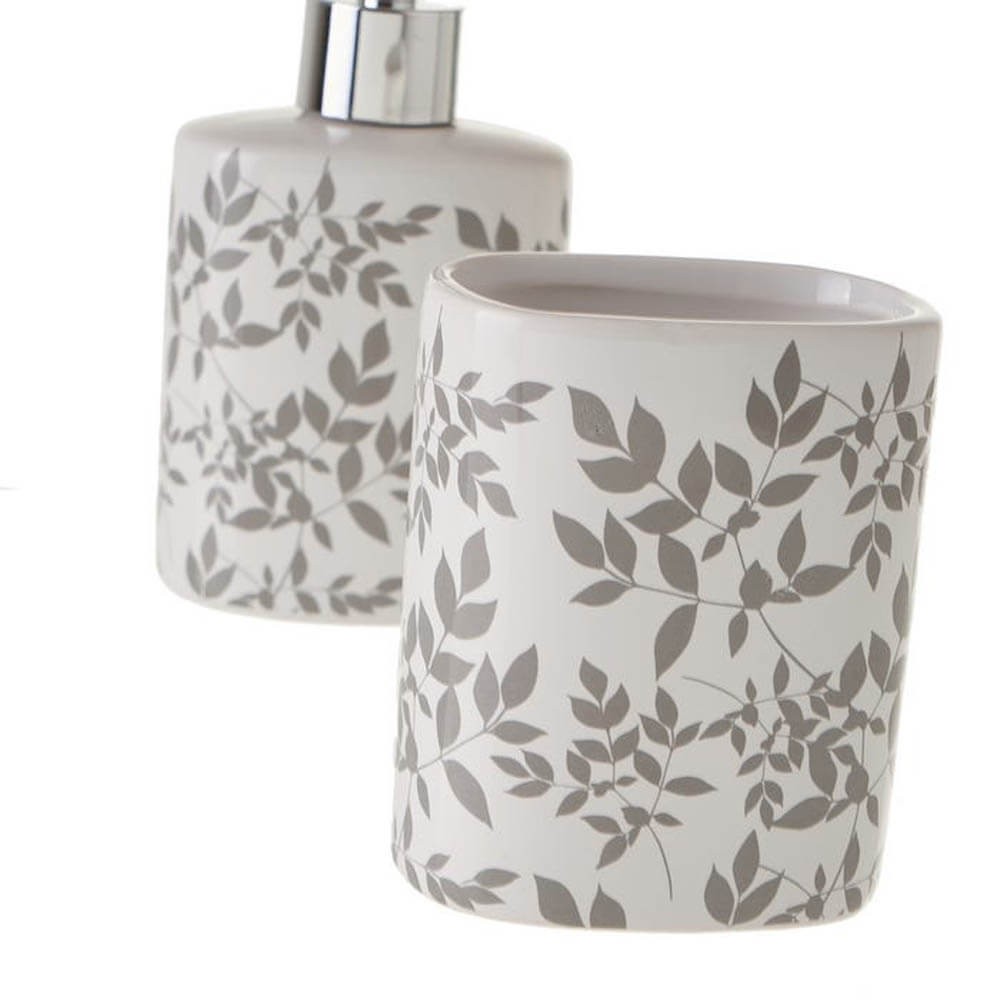 Juego de baño Linda compuesto por dos piezas de cerámica, dispensador de jabón y vaso porta cepillos de dientes con un elegante diseño de hojas.