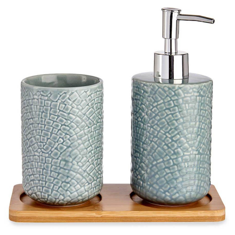 Juego de baño compuesto por un dispensador de jabón manual con cabezal de ABS, un vaso portacepillos de dientes y una bandeja de madera de bambú para contener las piezas. Ambos accesorios de baño están realizados en cerámica de color gris con un diseño en relieve de cuadros desiguales.