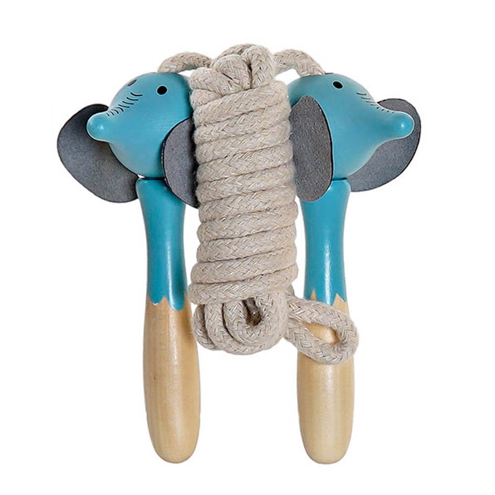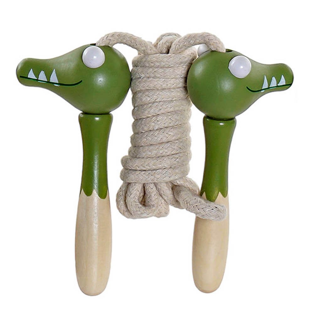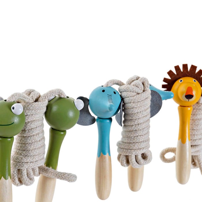 Comba infantil para niños mayores de 3 años, realizada a mano. La comba tiene un original diseño con mangos de madera en forma de animales, cocodrilo, elefante, león o ciervo y cuerda para saltar.