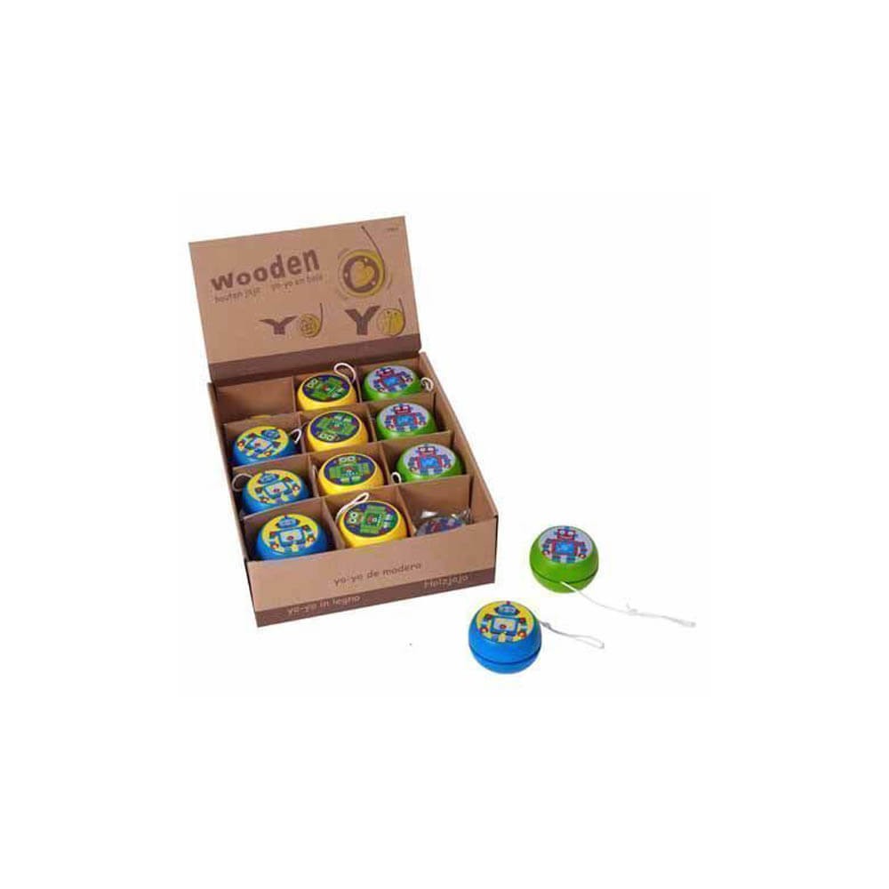 Yoyo de madera diseño robots en color verde, azul o amarillo.