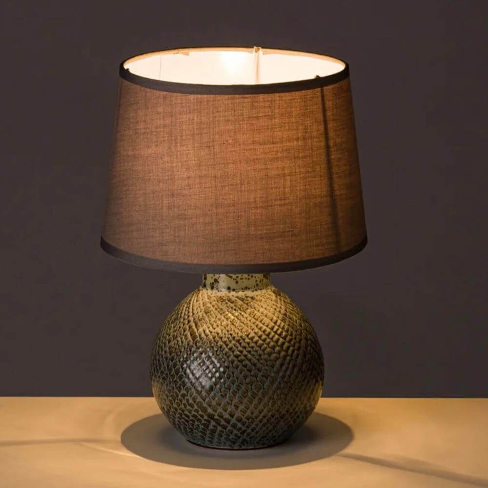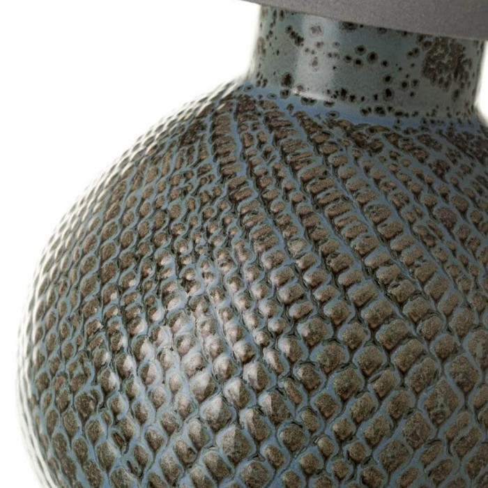 Lámpara mesilla de noche con base de cerámica realizada en gres esmaltado de color gris, diseño tipo bola con relieves. La lámpara lleva la pantalla confeccionada en TC de color gris. Una lámpara de mesa con un diseño clásico que marcara la diferencia de la estancia, perfecta para mesilla o cómoda.