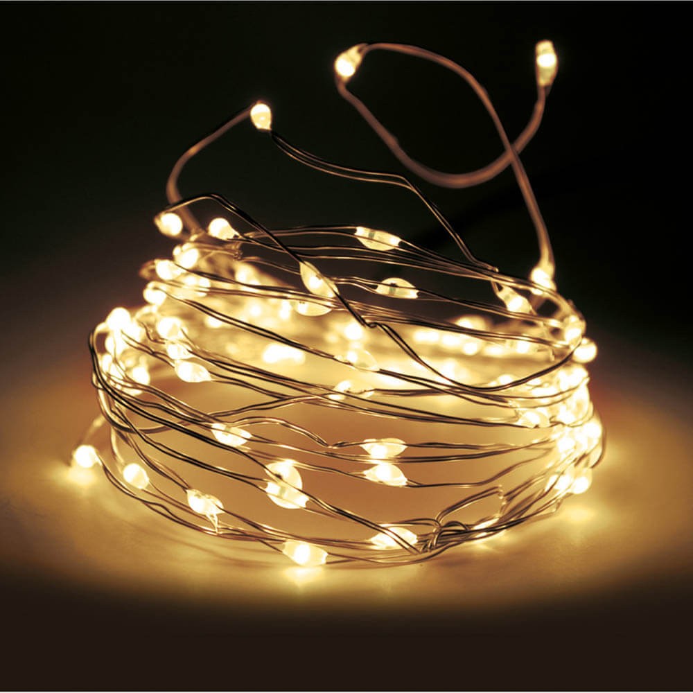 Guirnalda de luces con cable plateado y 20 microleds de color blanco cálido, perfecta para decorar pequeños rincones y crear un ambiente mágico. La distancia entre luces es de 5 cm.