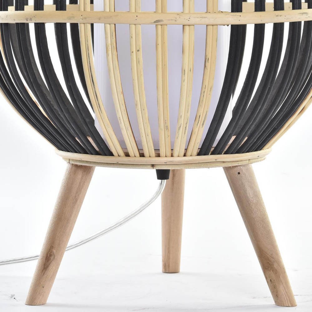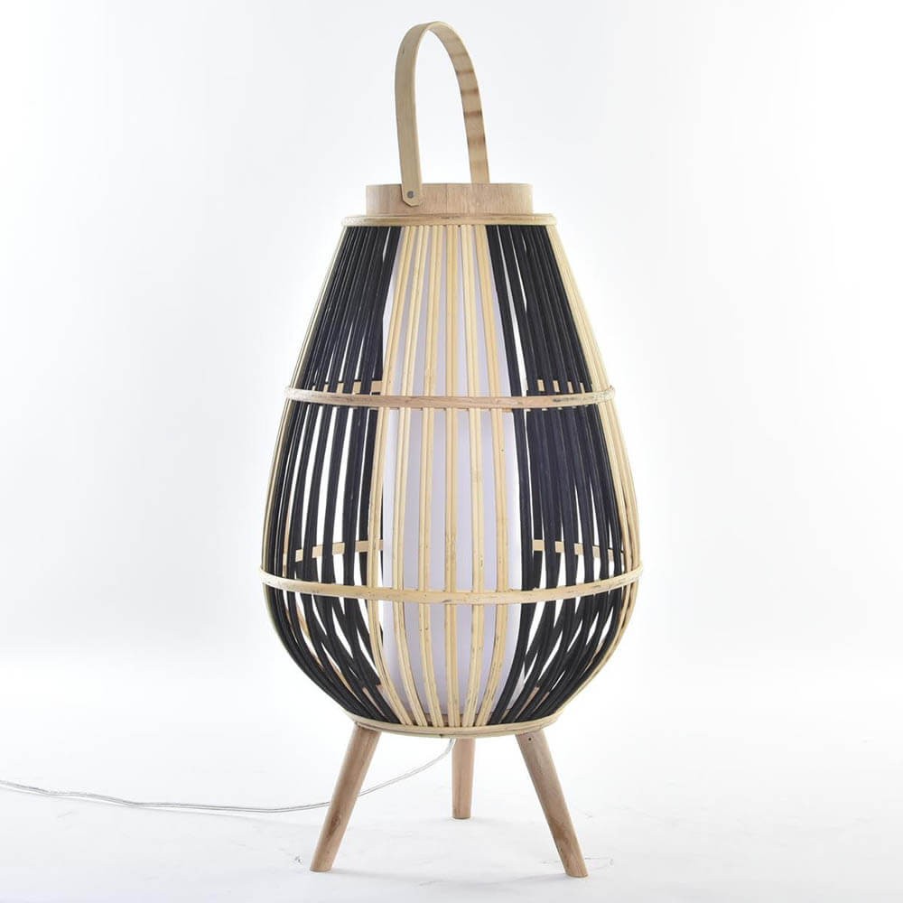 Lámpara de estilo tropical con estructura formada por varas de bambú en color negro y natural al rededor de una pantalla tubular de poliéster que distribuye la luz homogéneamente, lleva asa decorativa, base con tres patas de madera para colocar directamente en el suelo si se desea y cable de 135cm con interruptor en el mismo para encenderla y apagarla cómodamente.