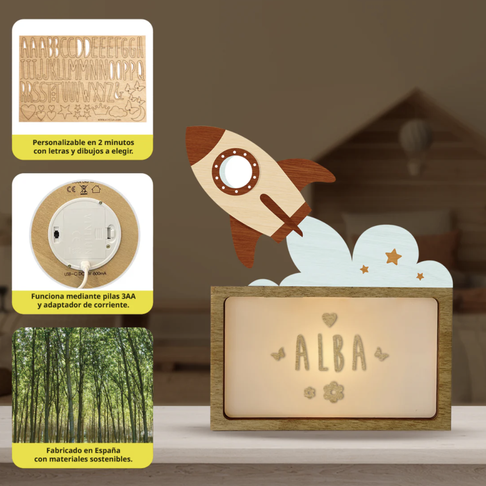- Diseño adorable: Cohete con recuadro iluminado.