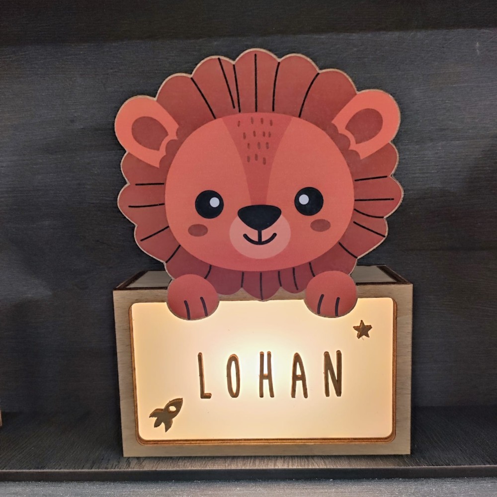 Ilumina la habitación de tu peque con la lámpara infantil personalizable con nombre, con un adorable diseño de leon que encantará a niñas y niños por igual. Esta lámpara no solo es una fuente de luz funcional, sino que también se convierte en un elemento decorativo único gracias a su recuadro iluminado, donde puedes personalizarla con el nombre de tu hijo o hija.