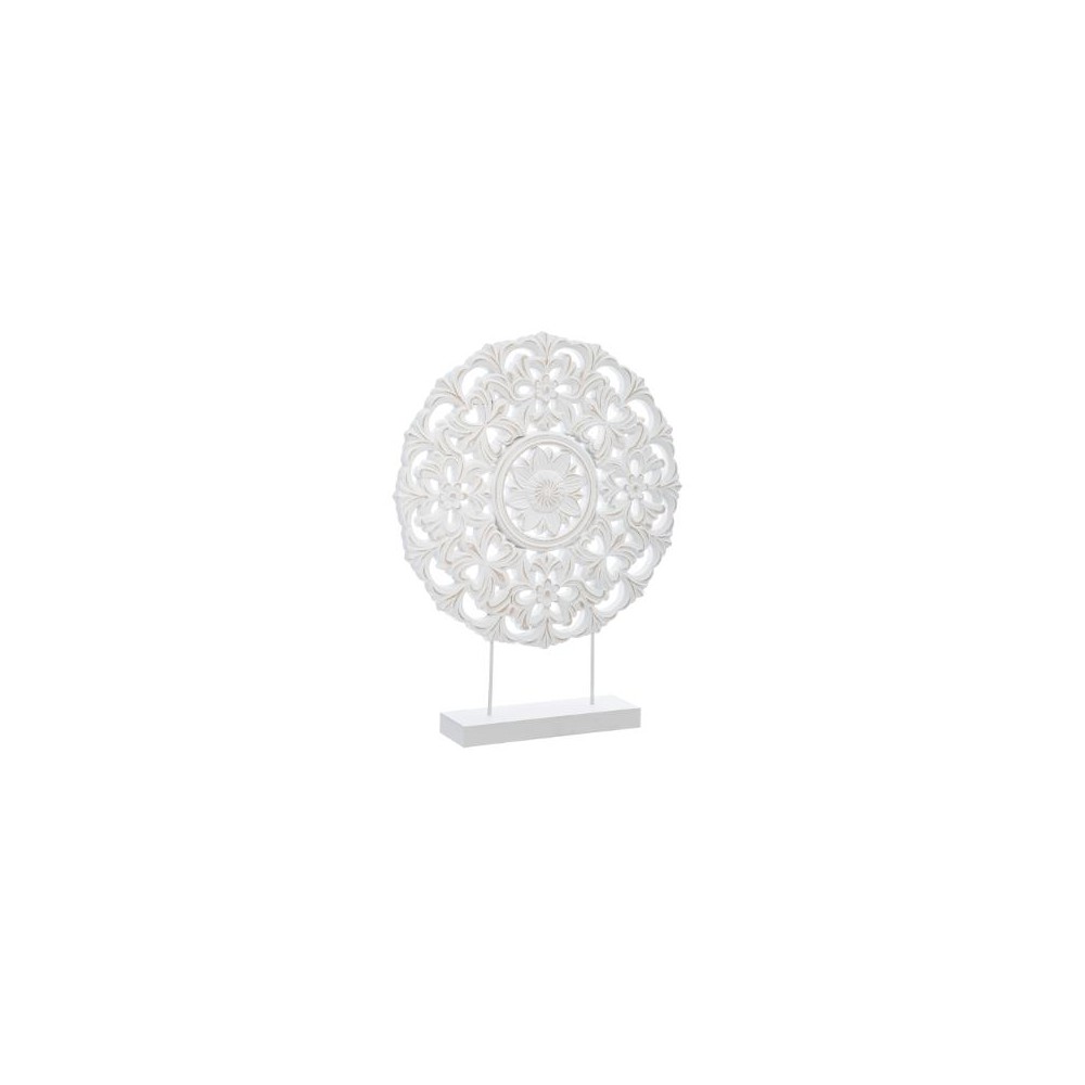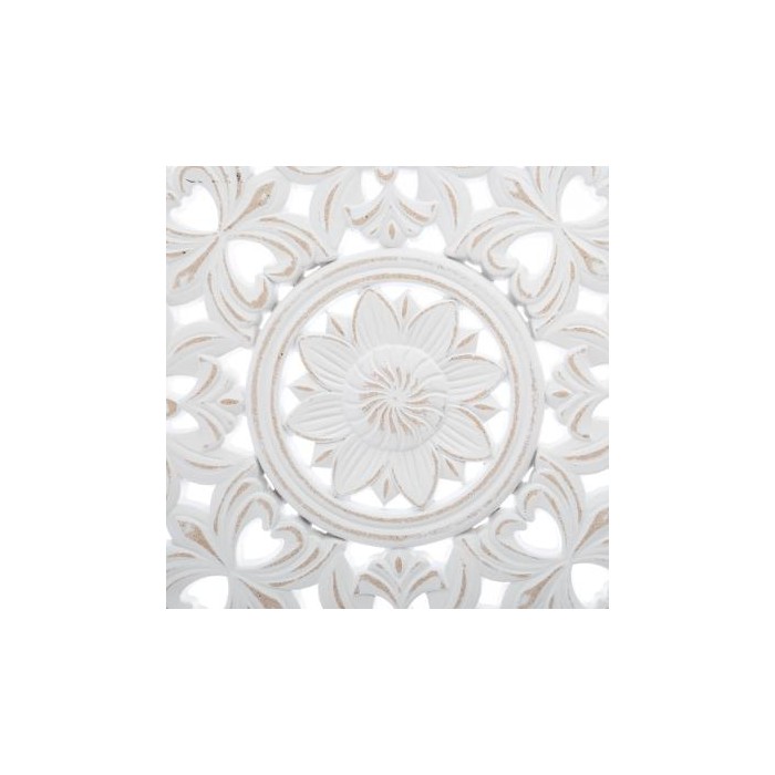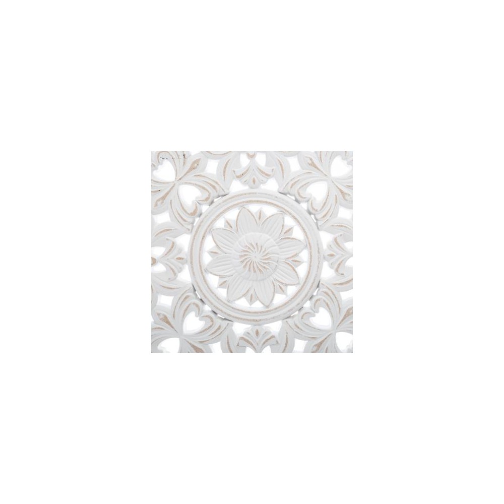 Mandala decorativo de diseño floral realizado en madera tallada MDF con acabado en decapé blanco, cuenta con dos pies metálicos blancos y una base rectangular que sostiene la pieza en MDF.