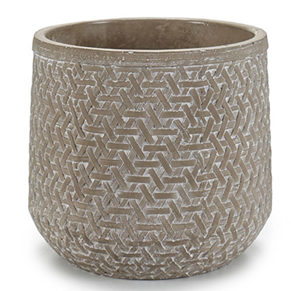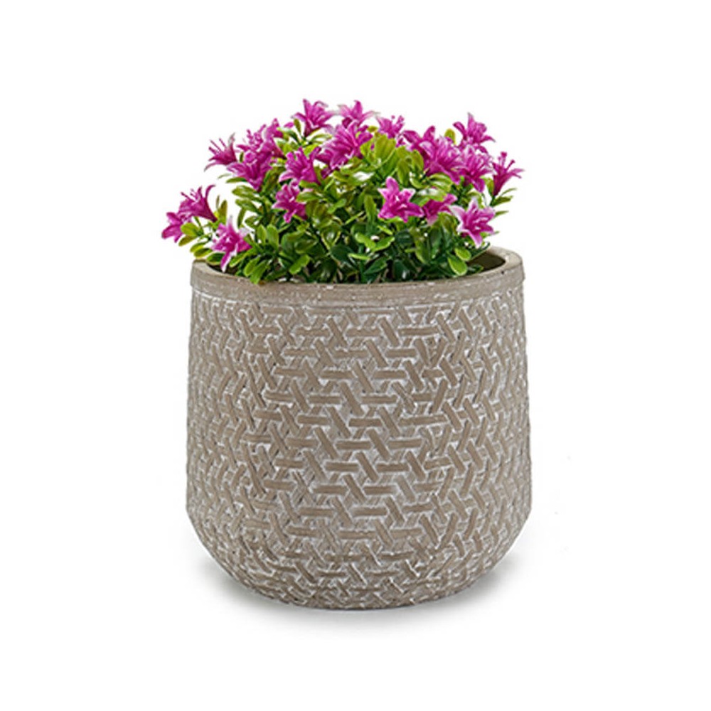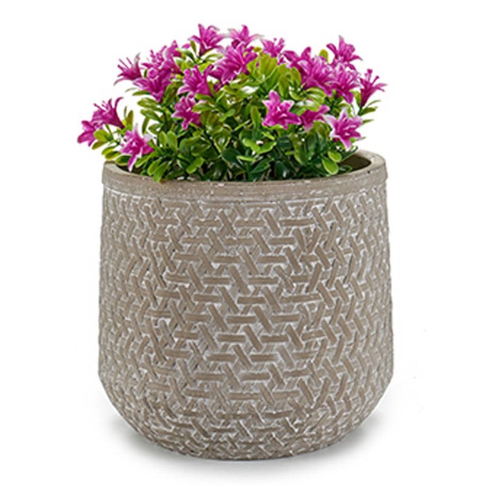 Macetero de 19 cm de diámetro realizado en cemento con dibujos en relieve, perfecto para colocar una planta aportando colorido y aroma al hogar.