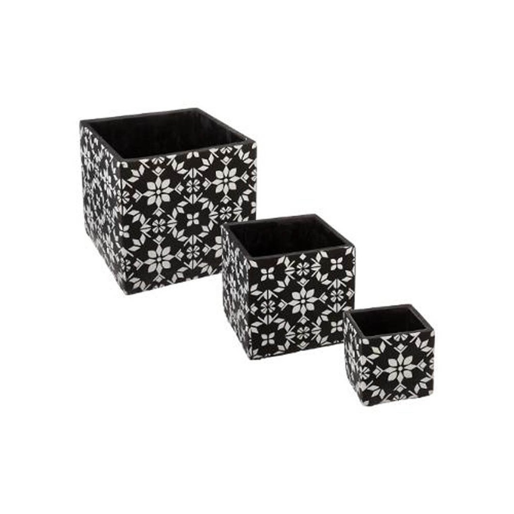 Macetero cuadrado diseño colonial realizado en una mezcla de cemento y tierra con un bonito dibujo geométrico en blanco y negro, perfecto para contener una planta y darle un aire nuevo. 2 modelos a elegir.