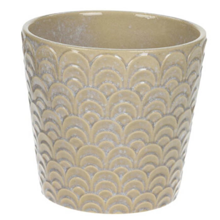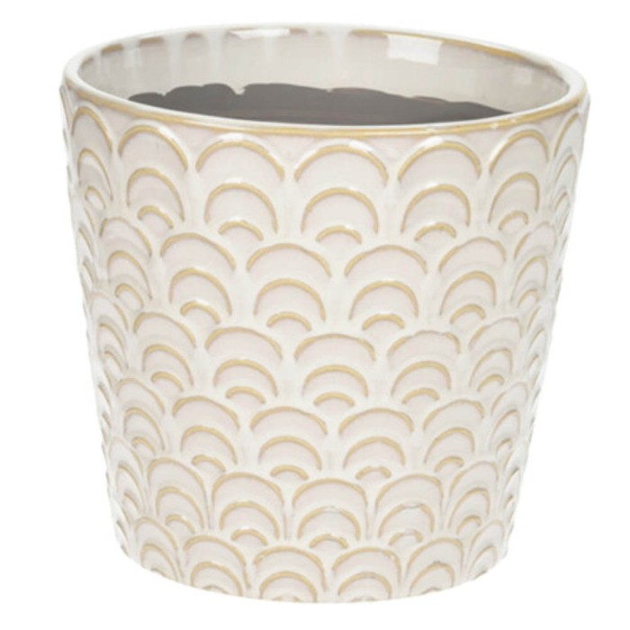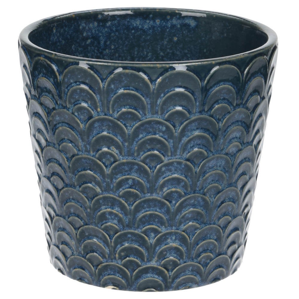 Macetero realizado en porcelana esmaltada con dibujos de medialuna en relieve realizando un atractivo diseño de escamas, perfecto para contener una planta y darle un aire nuevo. Disponible según stock en azul, blanco roto o crema.